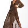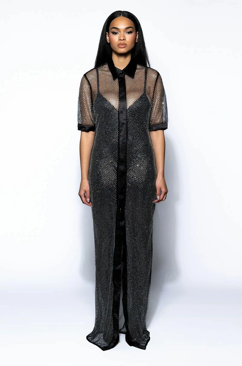 The AKIRA Label All Eyes Sparkle Rhinestone Polo Maxi Dress is made from a sheer rhinestone netting fabrication and features a collared neckline, boxy sleeves, a polo-like design, a sexy bodycon fit, satin trim along the collar, cuffs, and placket, and a maxi length silhouette. Complete with a covered snap button front placket.