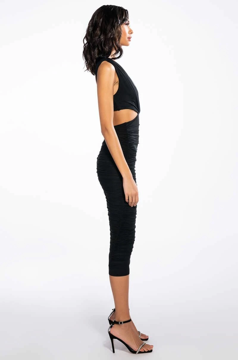 Big slay energy. The AKIRA Label Always A Slay This Way Low V Neck Midi Dress features a ruched mesh overlay, a stretchy and smooth base fabrication, wide ruched tank straps, a v neckline, side cut outs, and an open back. Complete with flattering ruched side and back detailing, a bodycon silhouette, midi length, and back zipper closure.