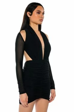 The AKIRA Label Always For You Ruched Mini Dress is made from a sheer, lightweight fabrication and features a plunging neckline, shoulder cutouts, long sleeves, a ruched, layered skirt, a bodycon fit, a sexy open back, a mini length silhouette, and a tonal back zipper closure. Pair this sultry piece with stiletto pumps and a small shoulder bag to complete your look.