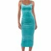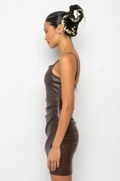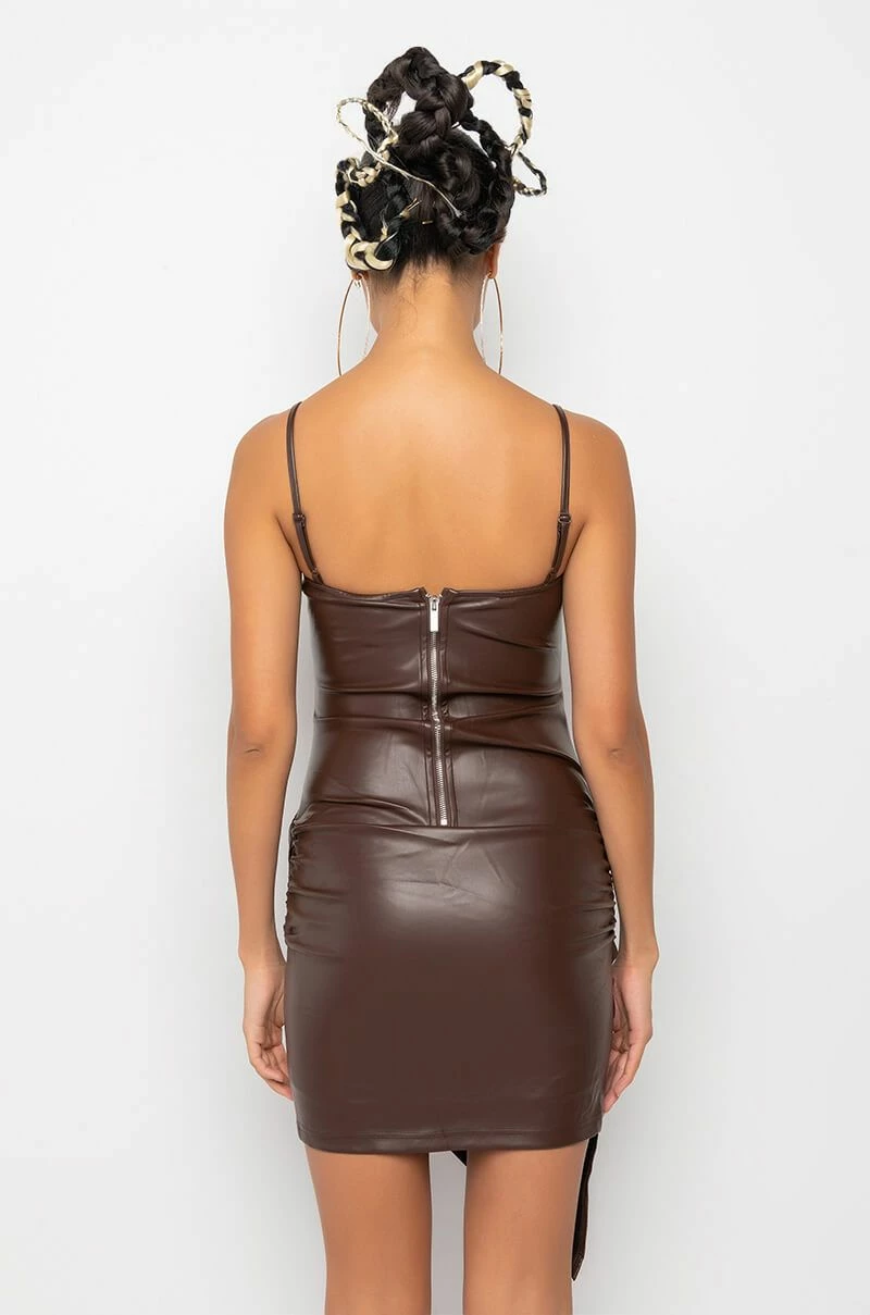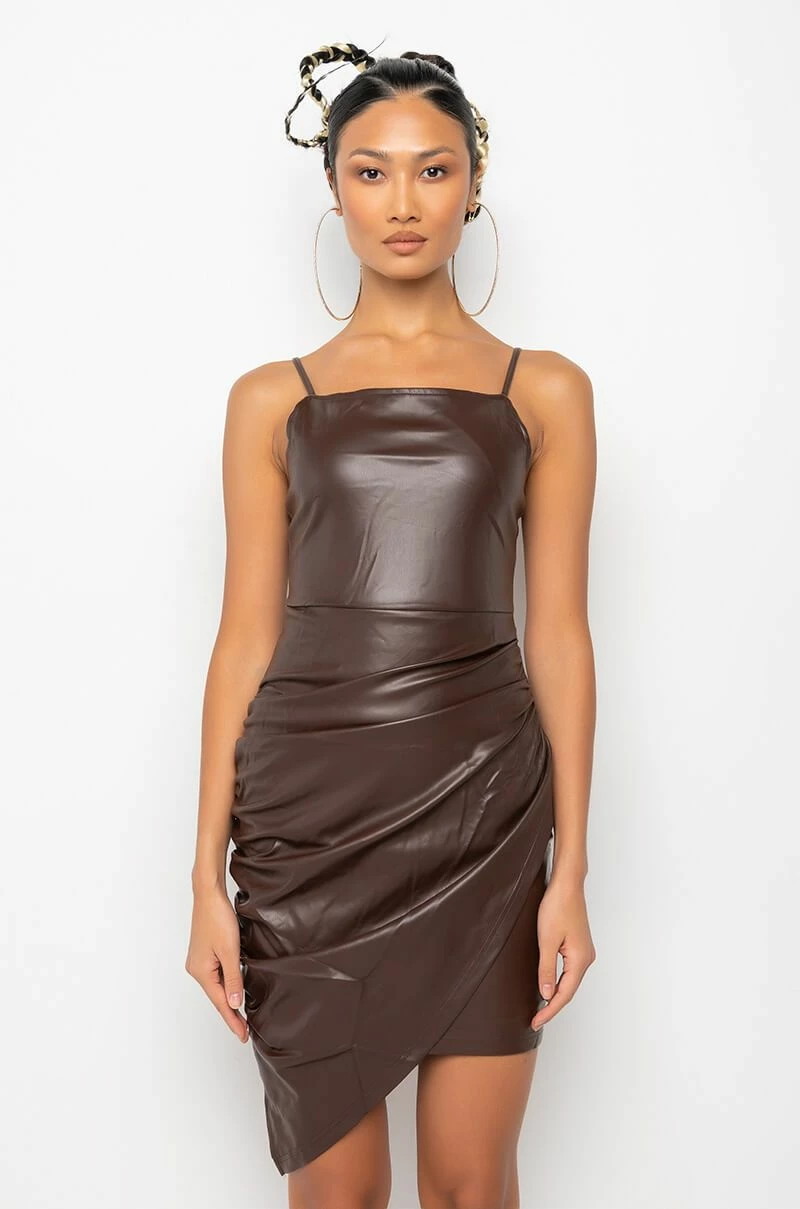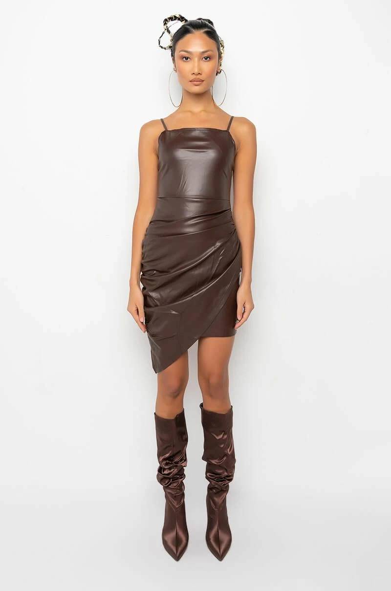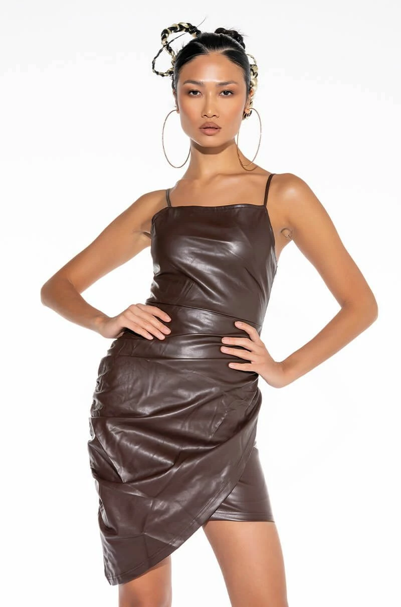 For that boss bitch whose name should be an anthem. This AKIRA Label Anthem Faux Leather Mini Dress is made of a super soft vegan leather fabric featuring adjustable spaghetti straps, a wrapped hem with ruching along both sides of the dress and a silver back zipper closure. Wear with tights, a cropped jacket and a black bootie for a simple, sexy look.