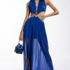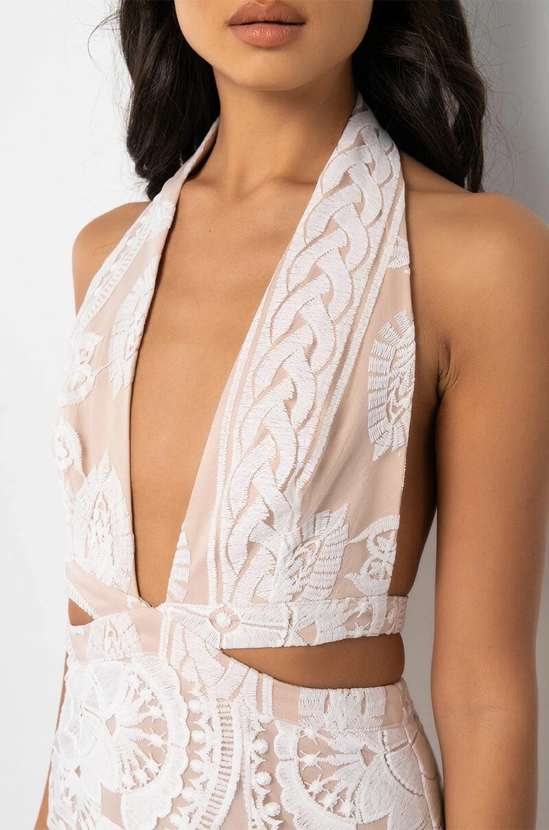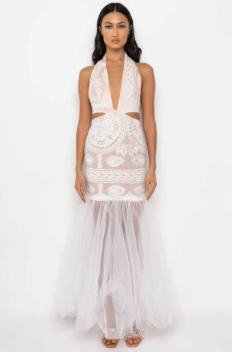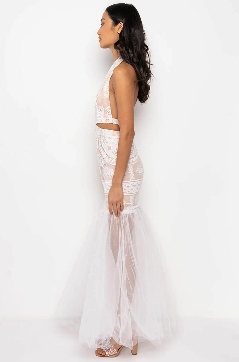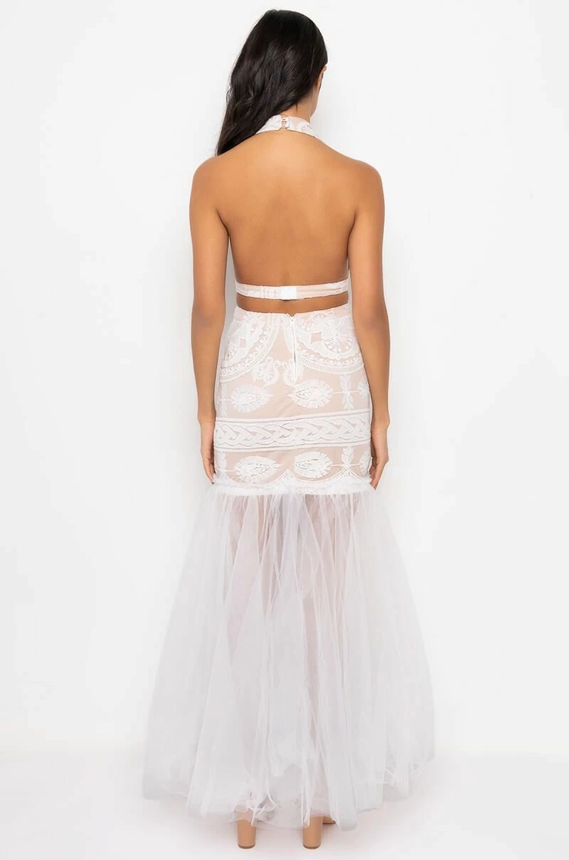 And don’t you forget it! The AKIRA Label Been The Queen Peplum Lace Maxi Dress features a halter-style neckline with button back closures, a v-front neckline, an open back, and a mini bodycon skirt lining with ornate lace detailing. Complete with a back zipper closure and a maxi length tulle skirt. Pair with a pearl-embellished headband for a luxurious look.
