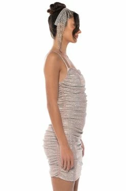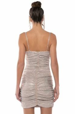 The AKIRA Label Better Than Ever Sleeveless Rhinestone Mini Dress is made from a shimmering glitter fabrication and features adjustable spaghetti straps, a cowl neckline, a sexy bodycon fit, rhinestone and ruched body detailing, polyester lining, and a mini length silhouette. Complete with a tonal back zipper closure. Pair this snazzy piece with strappy sandals and a faux fur coat to finish off your look.