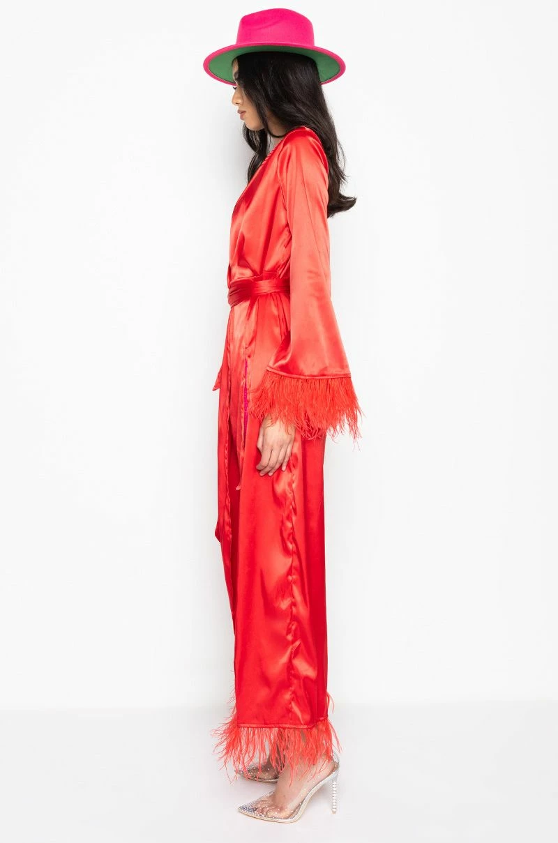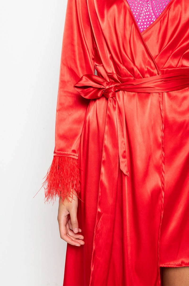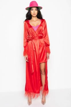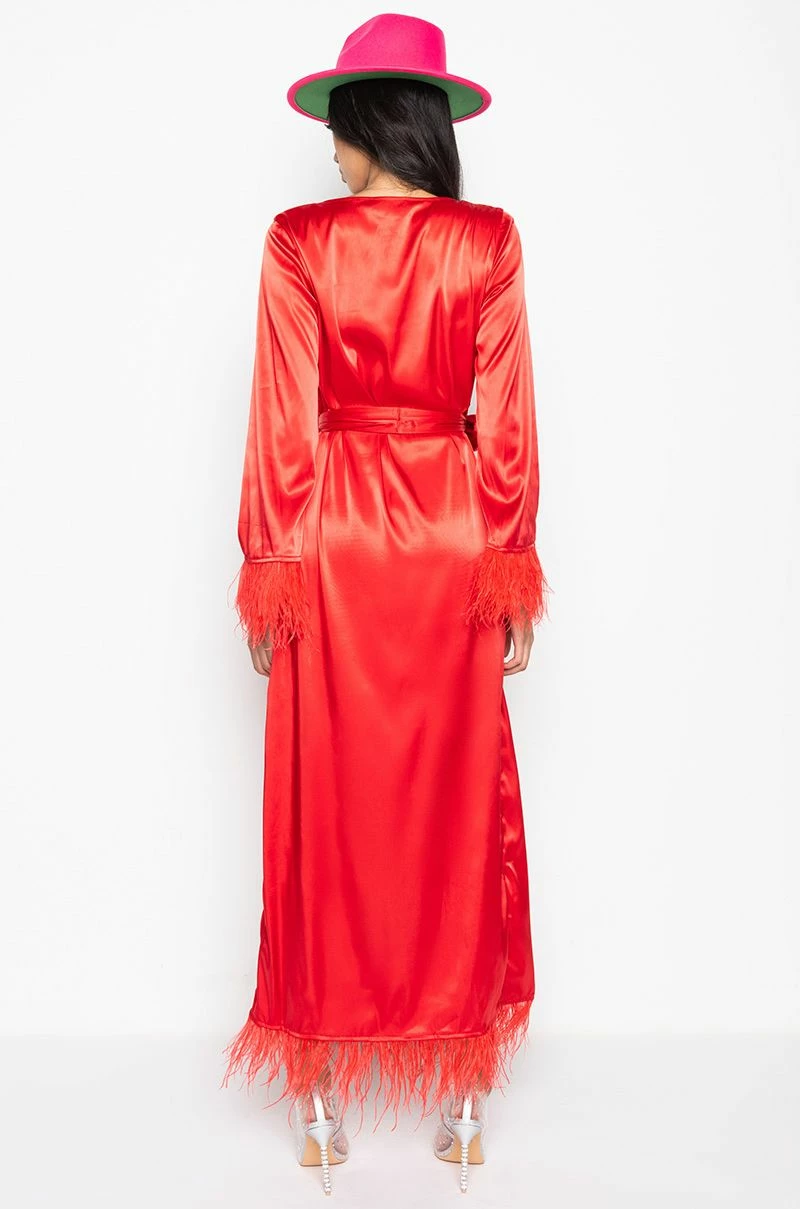 The AKIRA Label Boss Up Honey Maxi Dress With Feather Trim is made from a satin fabrication, and is complete with feather trim along the hemline and wrists, a front wrap design, low cut neckline, a waist belt, and a maxi length. Shown undergarments not included.