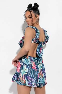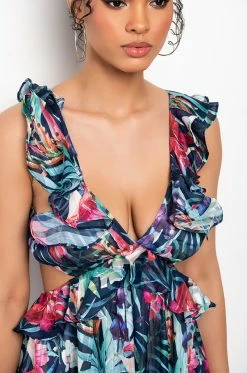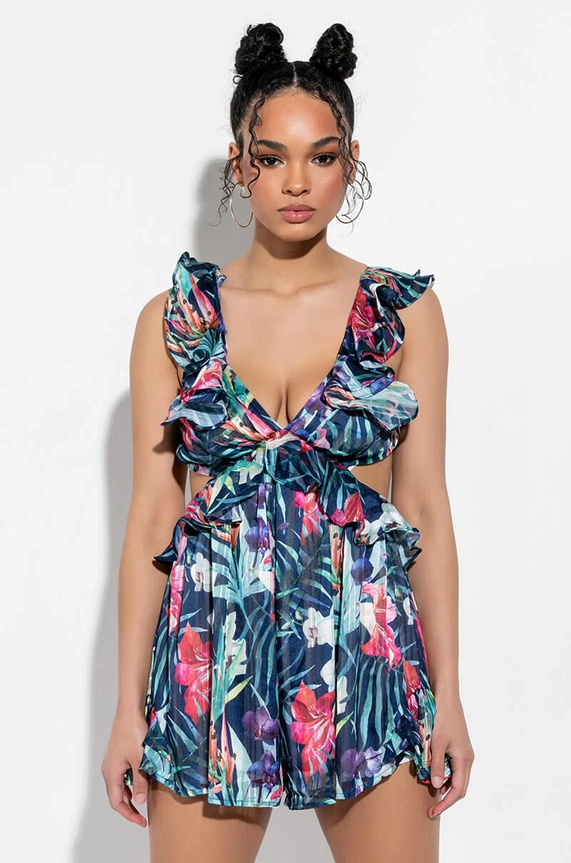 The AKIRA Label Brunch Alert Ruffle Mini Dress features a sheer chiffon overlay, a v neckline, ruffled tank straps, a backless design, tie back detail, and sexy side cutouts. Complete with ruffled skirt detailing, tropical print patterning, subtle metallic pinstripes, a smooth polyester lining, and an elastic back waistband.
