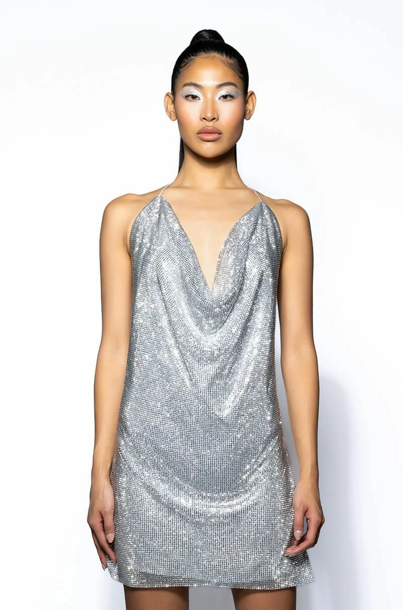 The AKIRA Label Call Me Your Highness Cowl Neck Rhinestone Sparkle Mini Dress is a glistening number featuring a rhinestone mesh outer layer, a satiny inner layer, a thin tie halter, a cowl neckline, a sleeveless design, a mini length silhouette, side slits, and a sexy open back. Pair this piece with platform pumps and a rhinestone clutch to complete your look.