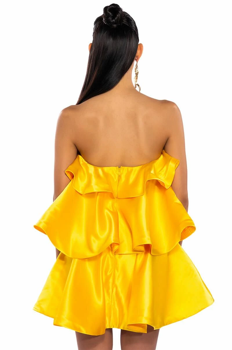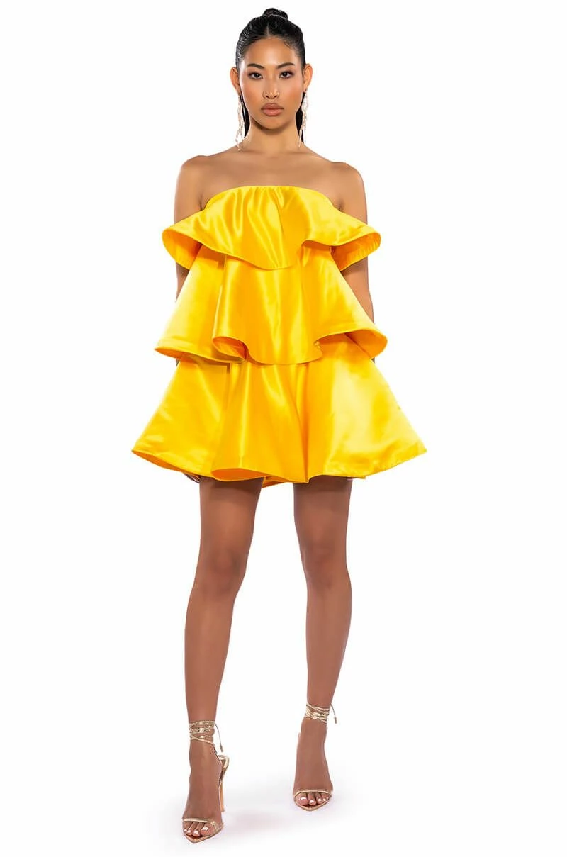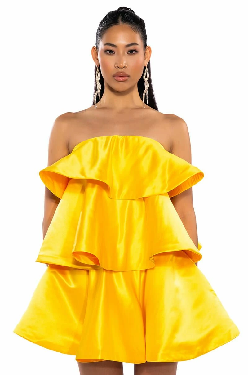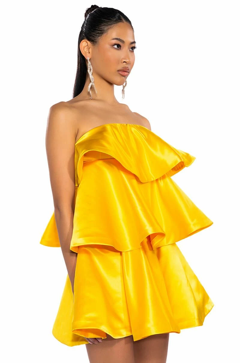 Steal the spotlight in The AKIRA Label Center Of Attention Layered Mini Dress! We’re obsessed with the satin base and voluminous tiered silhouette. Complete with a strapless neckline with inner elastic for a secure fit, a smooth inner lining, a mini length, and a concealed back zipper closure.
