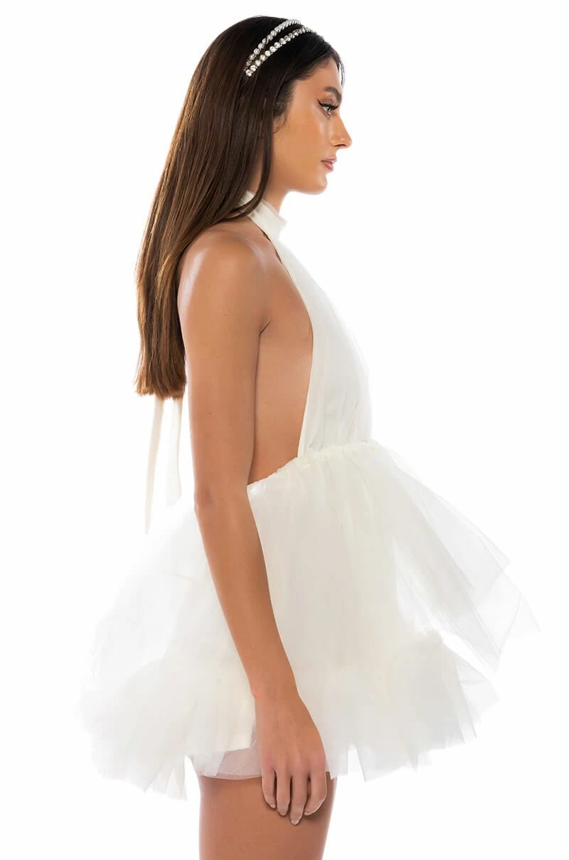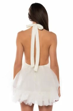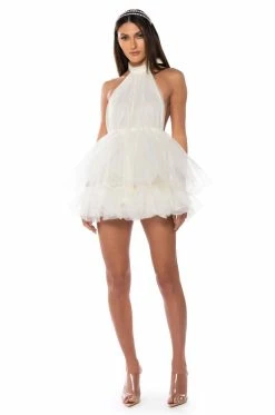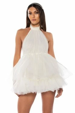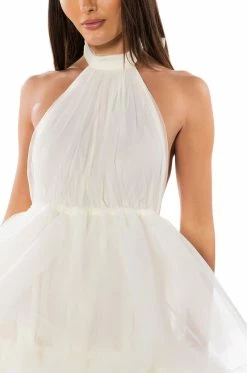 What, like it’s hard? The AKIRA Label Darling Diva Tulle Halter Neck Mini Dress In Cream is made from a lightweight, tulle fabrication and features a self-tie halter neckline, a sleeveless design, an elastic waist, layered tulle detailing, and a gorgeous open back. Complete with a mini length silhouette, a flared skirt with a slick inner lining, and a slip-on fit. Style with platform pumps and a statement piece clutch for the full fantasy!