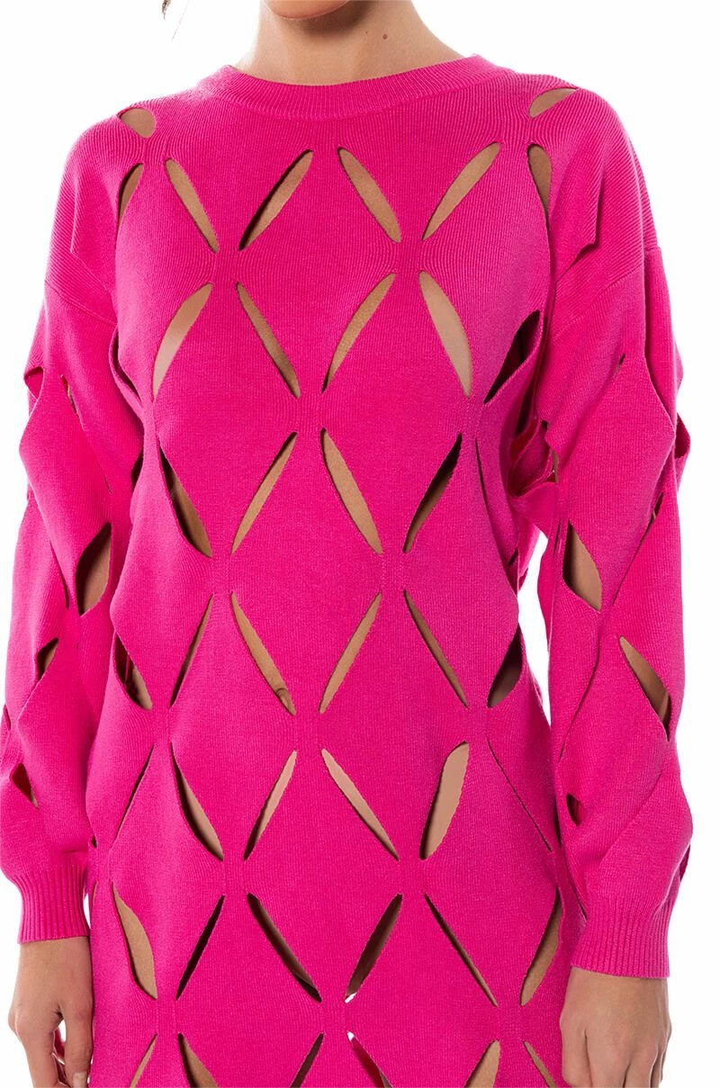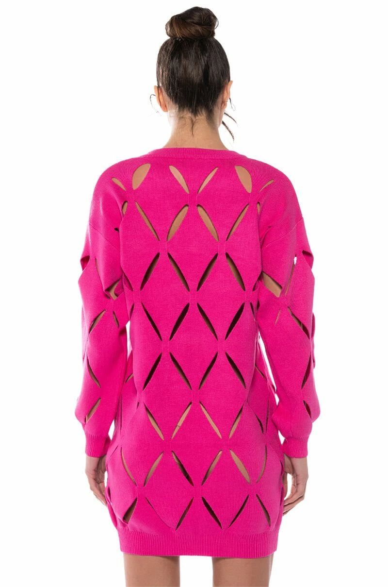 The AKIRA Label Diamond Cut Oversized Sweater Dress features a soft knit fabrication, a ribbed knit crew neck design, long sleeves with ribbed knit hems, and sexy cut out geometric detailing throughout. Complete with a mini length and a slip on fit. Style over faux leather pants and pointed heels or on its own with knee-high boots to finish off your eye-catching look.