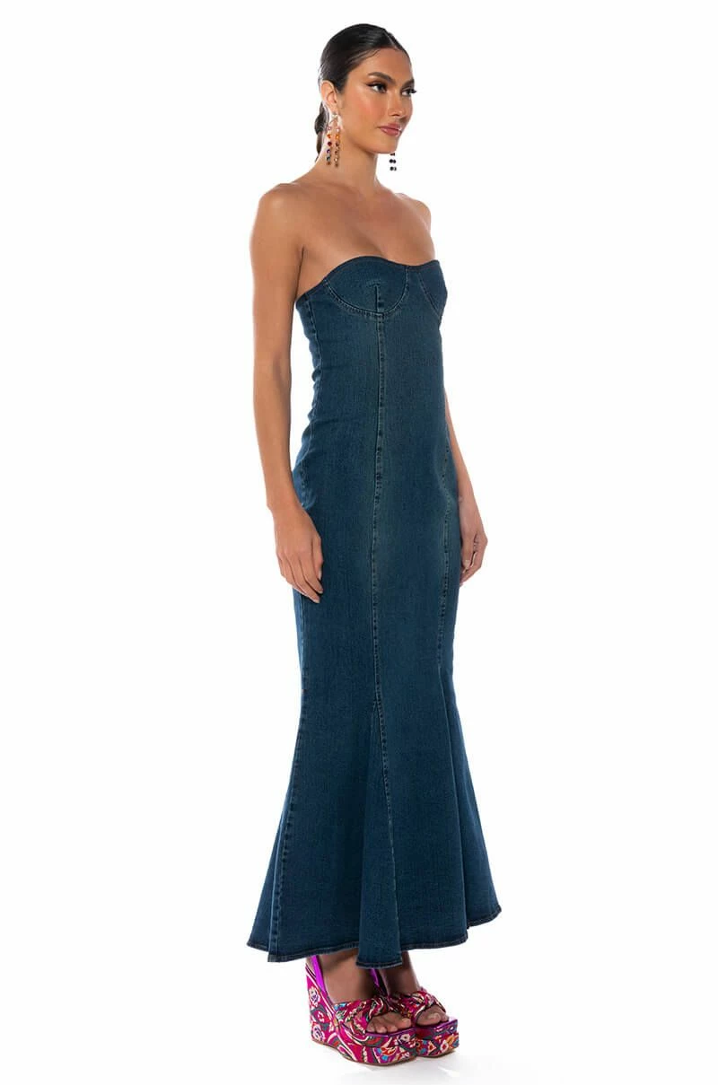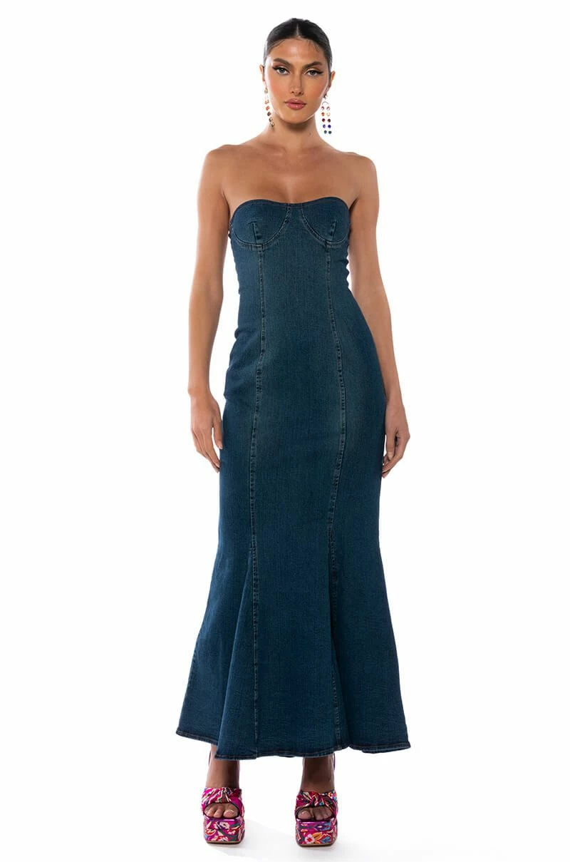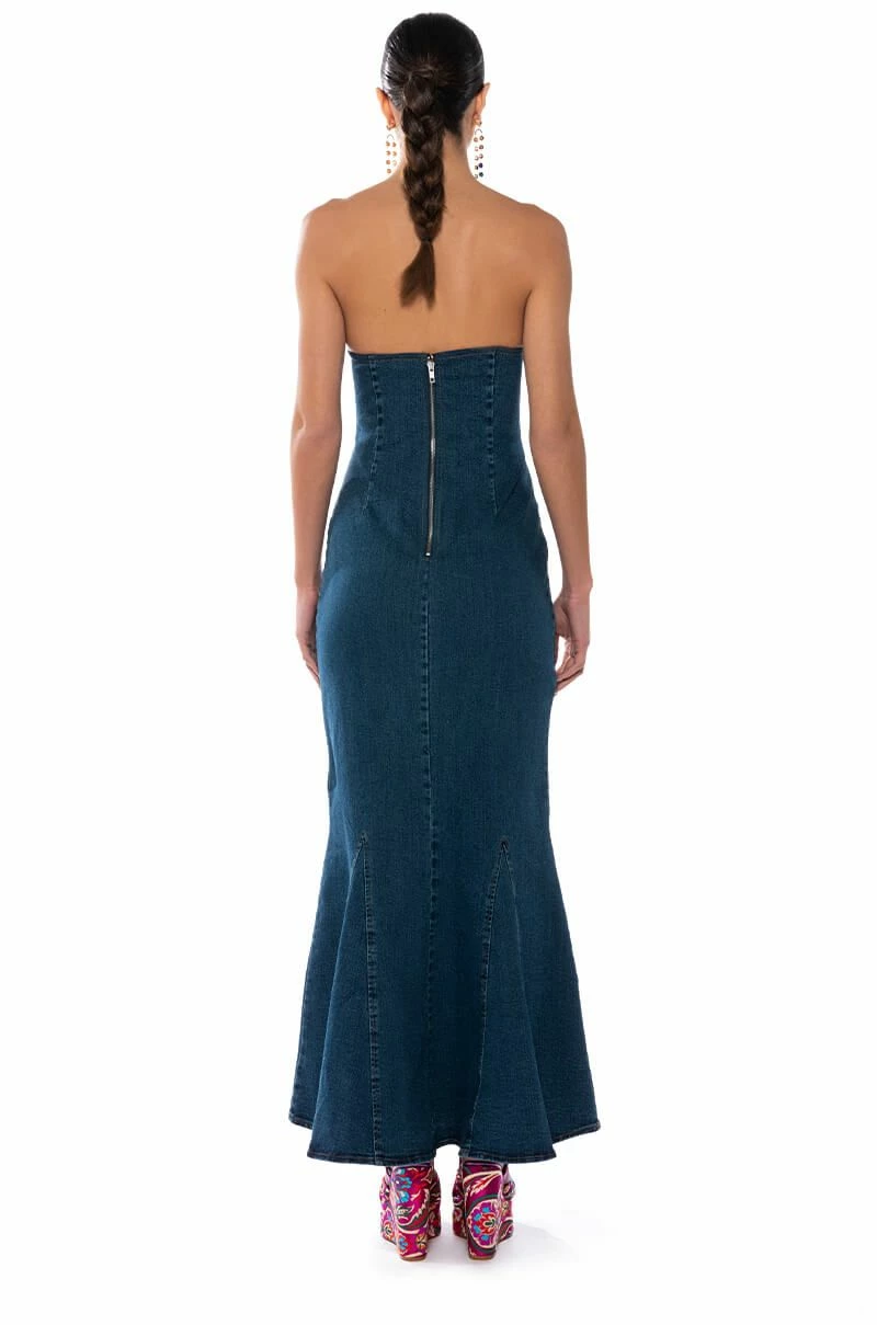 Happy hour just got a little hotter. The AKIRA Label Dinner Date Vibe Flare Denim Maxi Dress is a sexy, curve-skimming stretch denim dress featuring a strapless sweetheart neckline, a maxi length silhouette, and a flared mermaid hem. Complete with an exposed silver metallic back zipper closure.