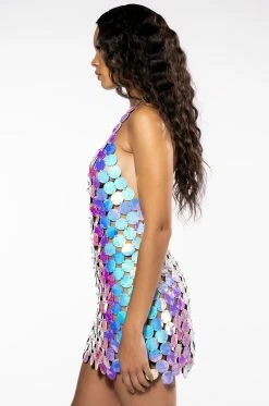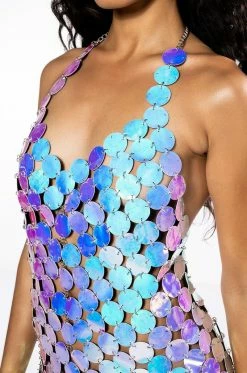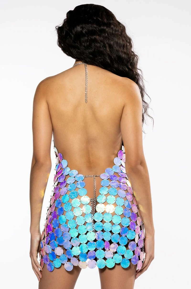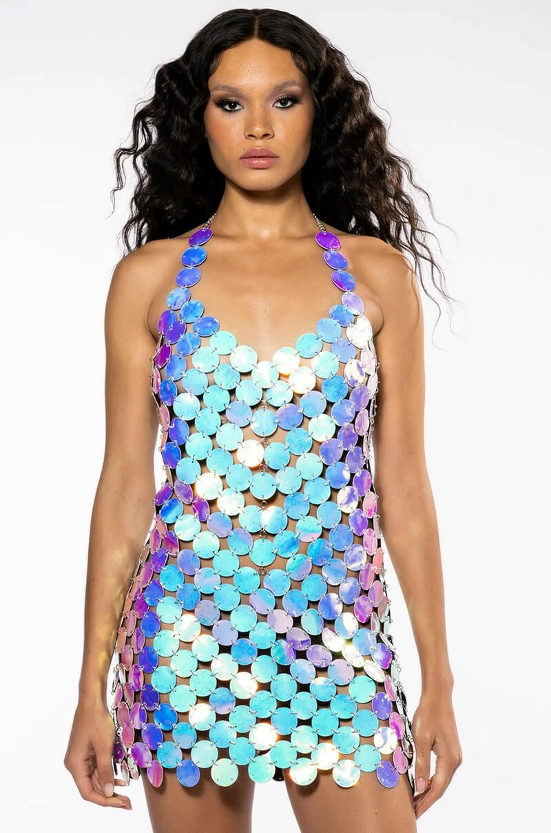 Dancing Kweeen! Make a mod statement in The AKIRA Label DISCO BABE HOLOGRAPHIC SHIFT DRESS. This glamorous dress features an unlined construction consisting of lightweight metallic discs, silver metallic links, and a halter neck strap. Complete with a mini length silhouette, a v-neckline, a open back design and hook and chain clasp closure.