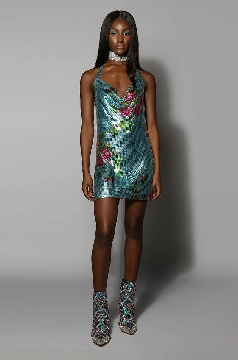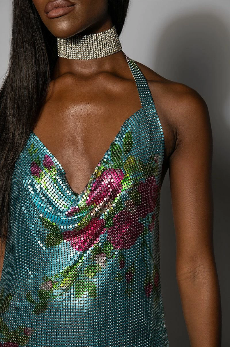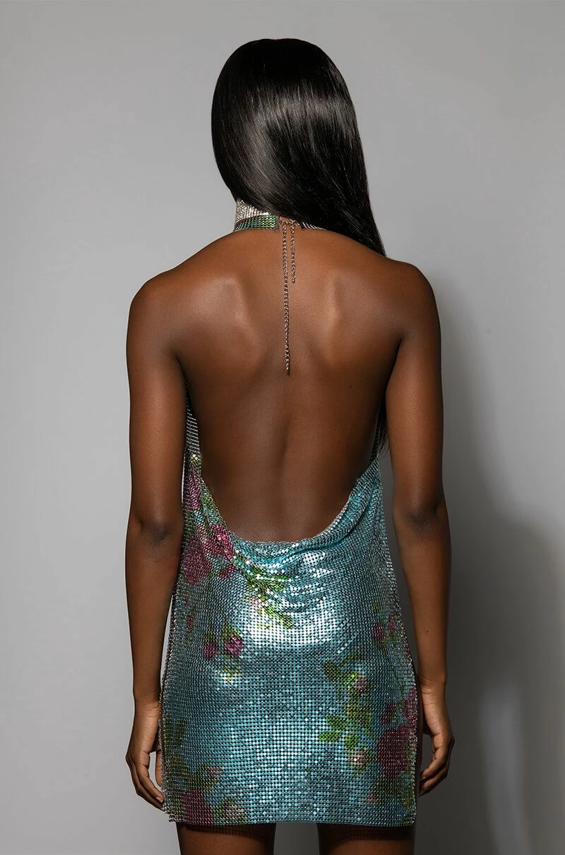 She’s the chainmail dress of our dreams… The AKIRA Label Dream Floral High Shine Chainmail Mini Dress is made from a metallic chainmail fabrication and features a cowl neckline, a floral art print, and a stunning open back. Complete with high side slits and an adjustable lobster claw chain closure at the neck. Pair this sleeveless edgy mini dress with pumps and a clutch for a completed look!