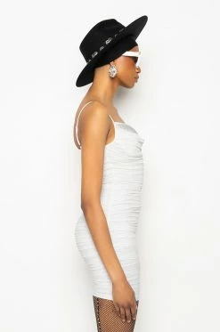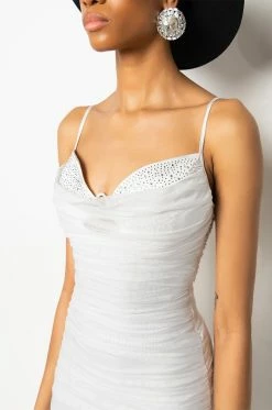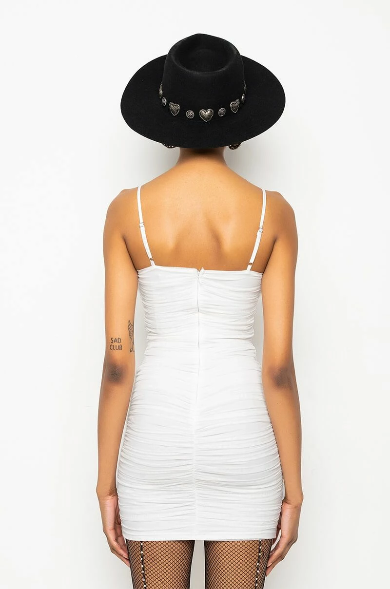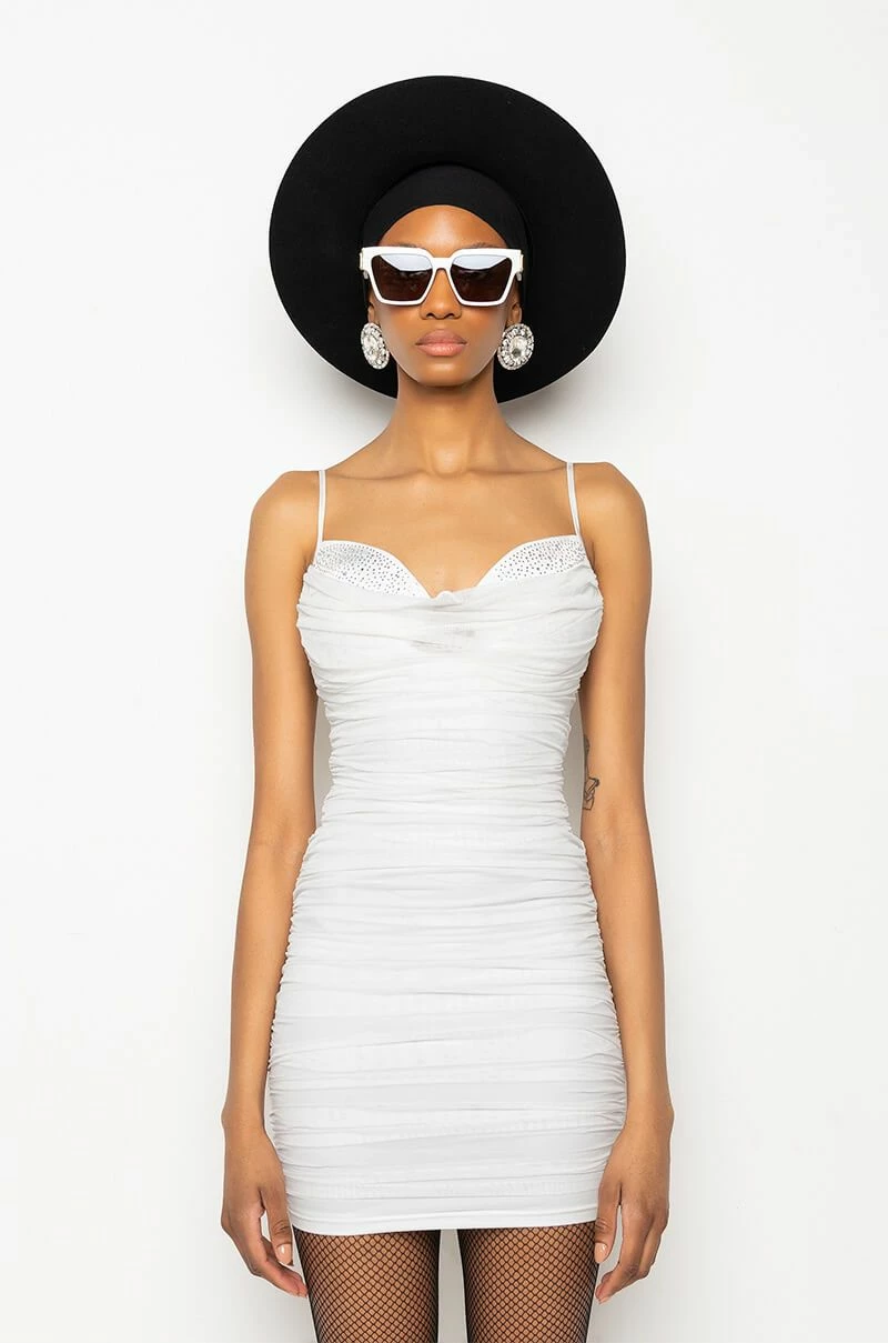 The AKIRA Label Everything You Hear About Mesh Mini Dress is made of a layered mesh fabrication and is complete with a wired plunge neckline, padded cups with rhinestone detailing, adjustable spaghetti straps, mini length, a ruched body, and a back zipper closure.