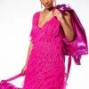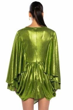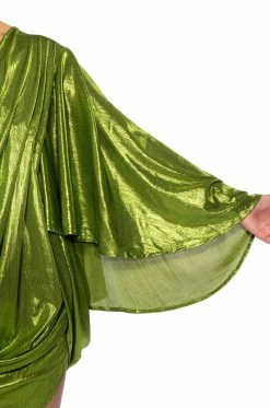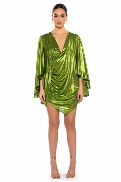 Live your futuristic goddess fantasy with The AKIRA Label Fantasy Draped Metallic Mini Dress! This elegant piece is made from a slick, metallic fabrication and features a plunging neckline, long, draped open sleeves, ruched side body detailing, and a mini length silhouette. Complete with a pull-on fit and concealed back zipper. Pair this draped fit with chunky knee-high boots for a twisted fantasy look!