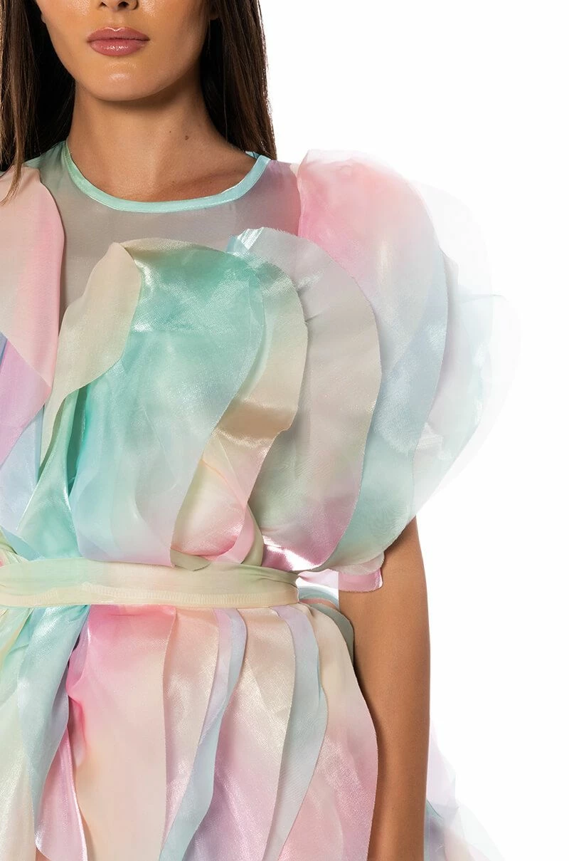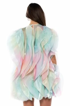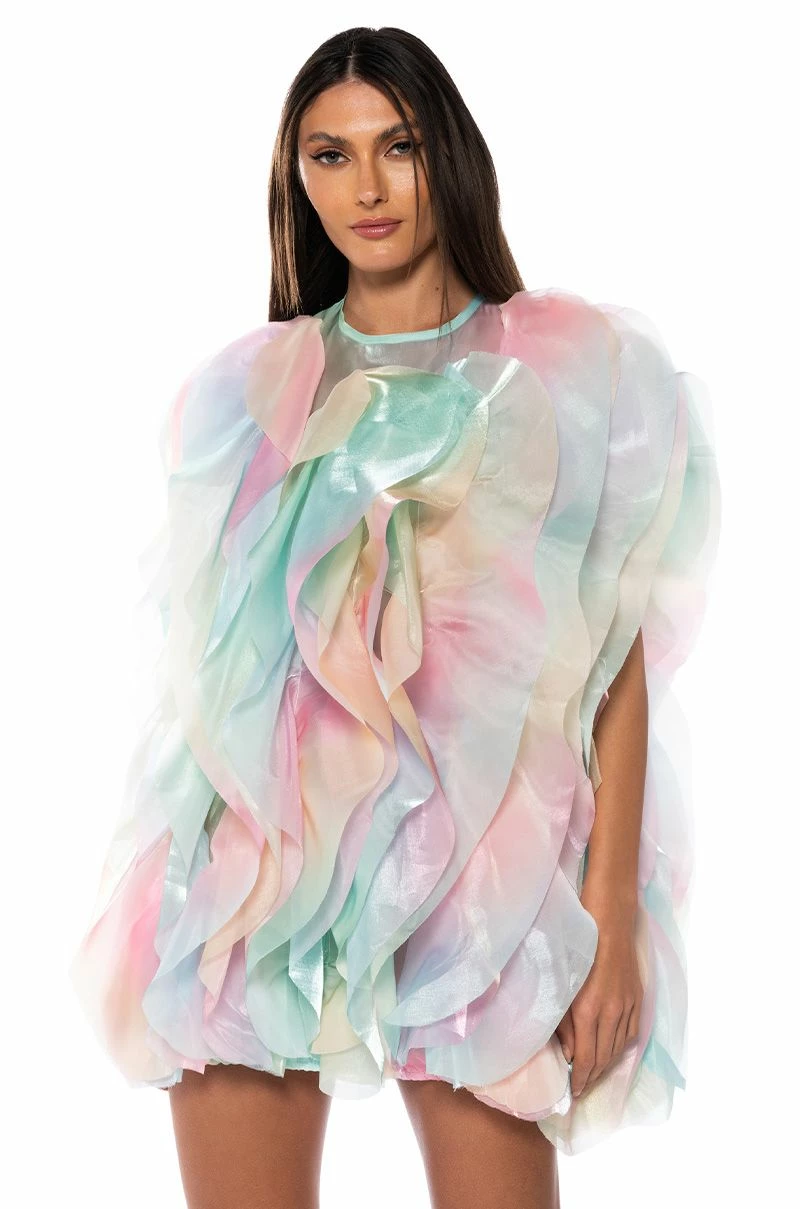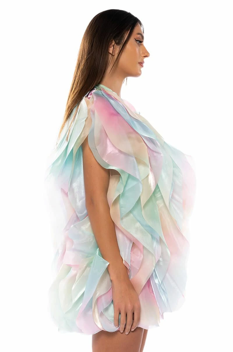 The AKIRA Label Float Like A Butterfly Mini Fashion Dress In Blue Multi is made from a sheer fabrication and features a pastel ombre rainbow print, a sleeveless silhouette, layered vertical ruffle detailing, a mini length, elastic hem, a coordinating self tie belt, and a keyhole back with a single button closure.