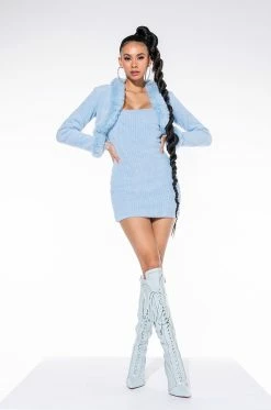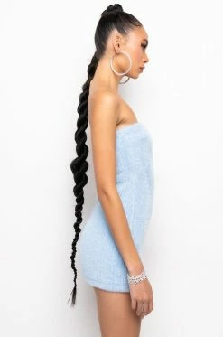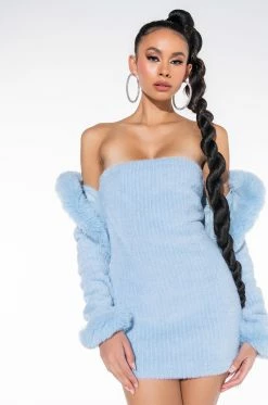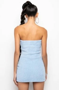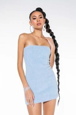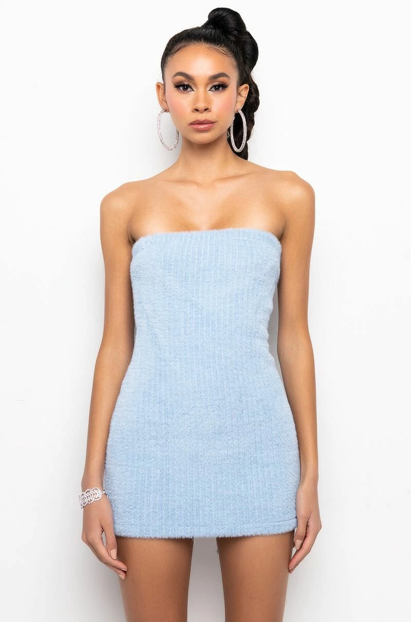 Live your Y2K dreams with The AKIRA Label Get A Clue Fuzzy Blue Tube Dress. This strapless mini length piece features a plush fuzzy ribbed knit fabrication, a straight across neckline, and elastic hems. Complete your look with the coordinating AKIRA Label Get A Clue Fuzzy Blue Crop Sweater , PVC pumps, and rhinestone accessories.