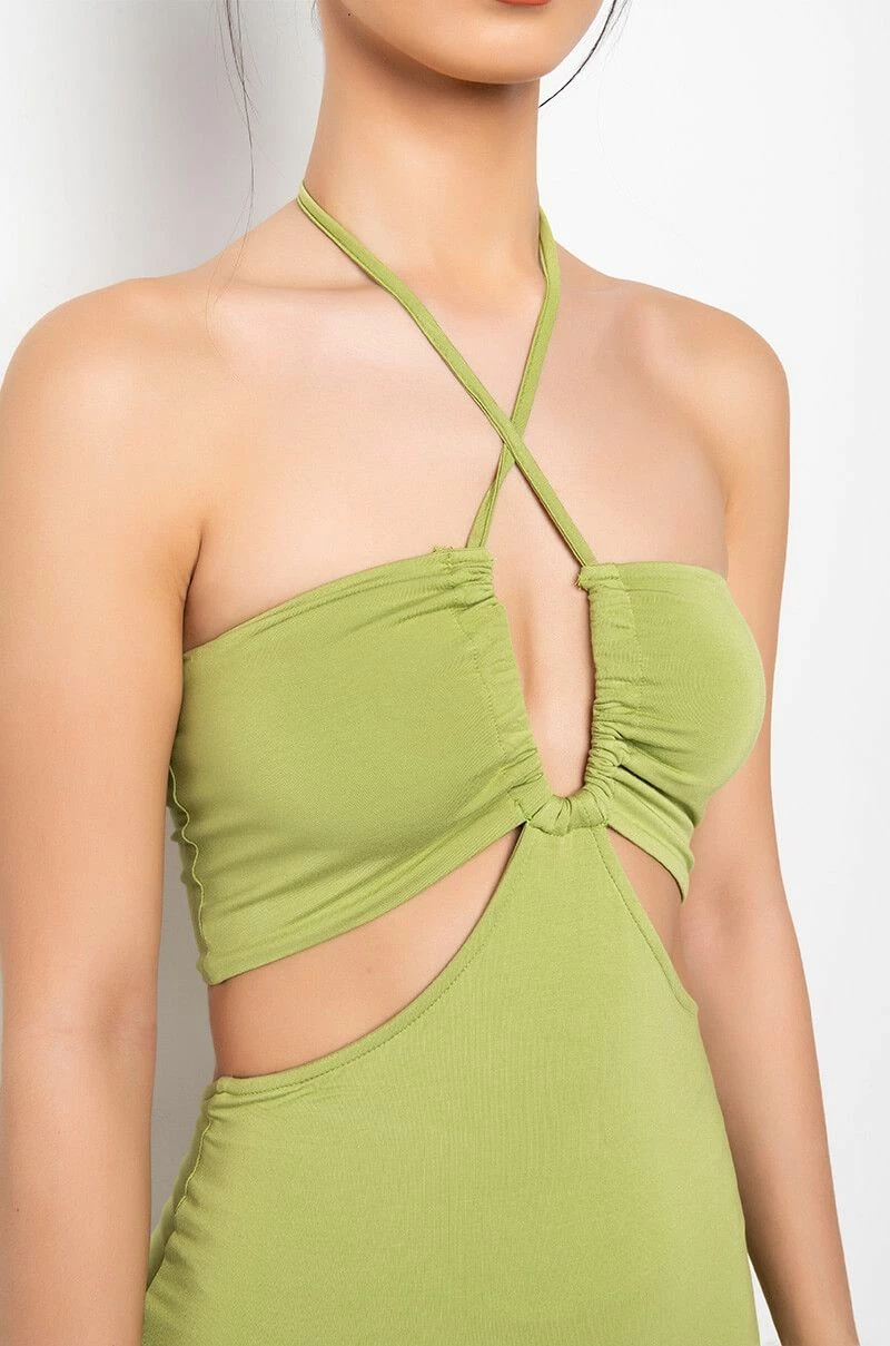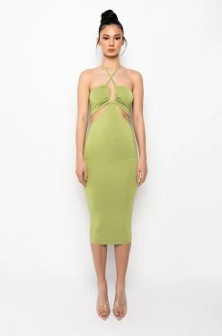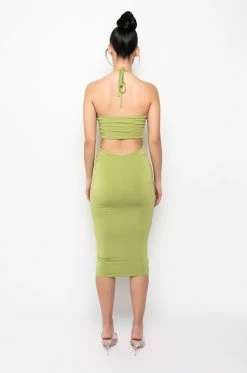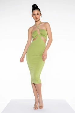 The AKIRA Label Get Right Midi Halter Top Dress is made from a smooth and stretchy fabrication and is complete with a tie back halter neckline, a center U ring detail, waist cutouts, an open back, stretchy lining, a pull-on fit, and a midi length.