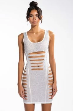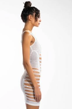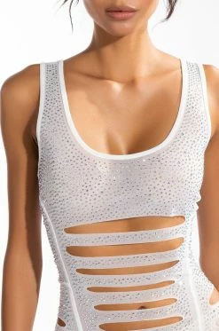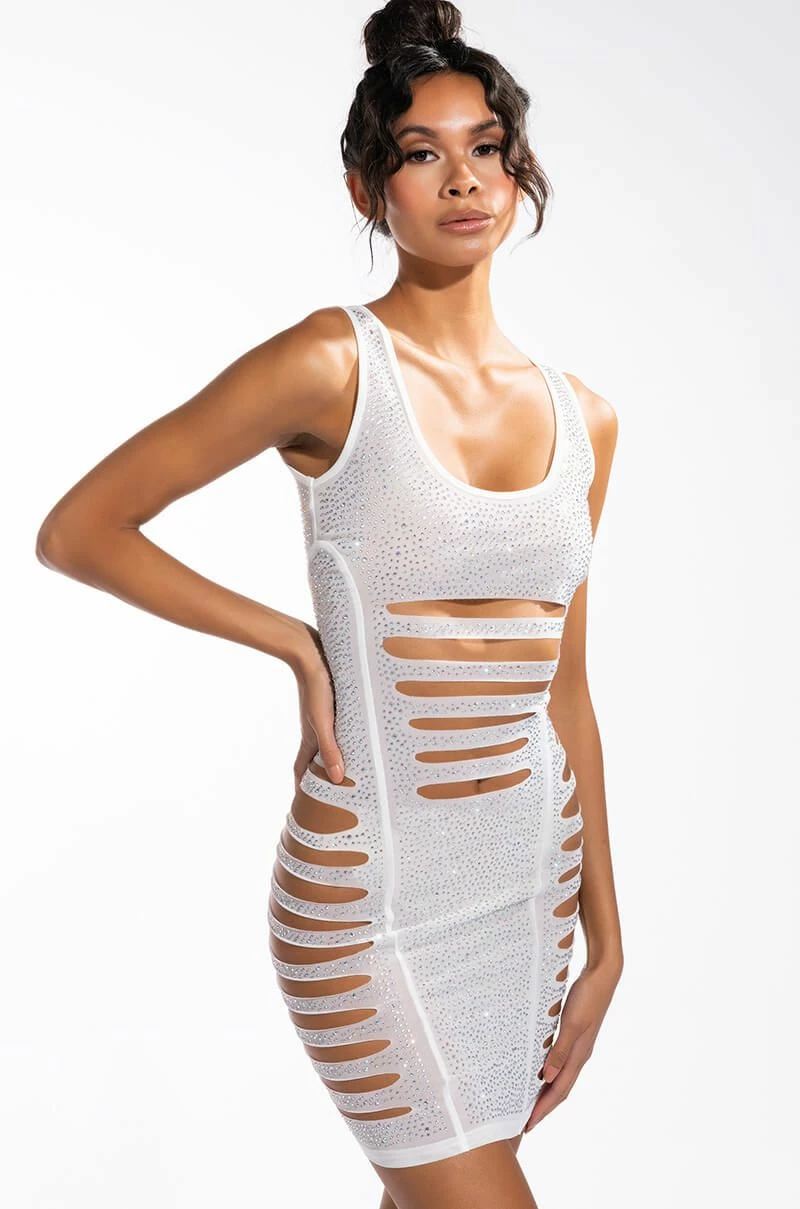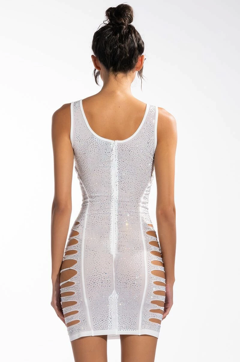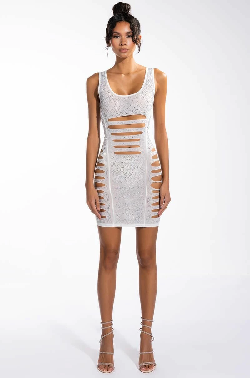 The AKIRA Label Girls Just Want To Have Fun Mini Rhinestone Dress is an ultra sexy, sparkling number made from an unlined mesh fabrication featuring allover iridescent rhinestone detailing, tank straps, a rounded neckline, contrast trim, a voluptuous bodycon fit, slashed cutouts along the bodice and sides, a mini length silhouette, and a tonal back zipper closure. Layer this piece over bodysuits or bralettes for a girl’s night out party look!