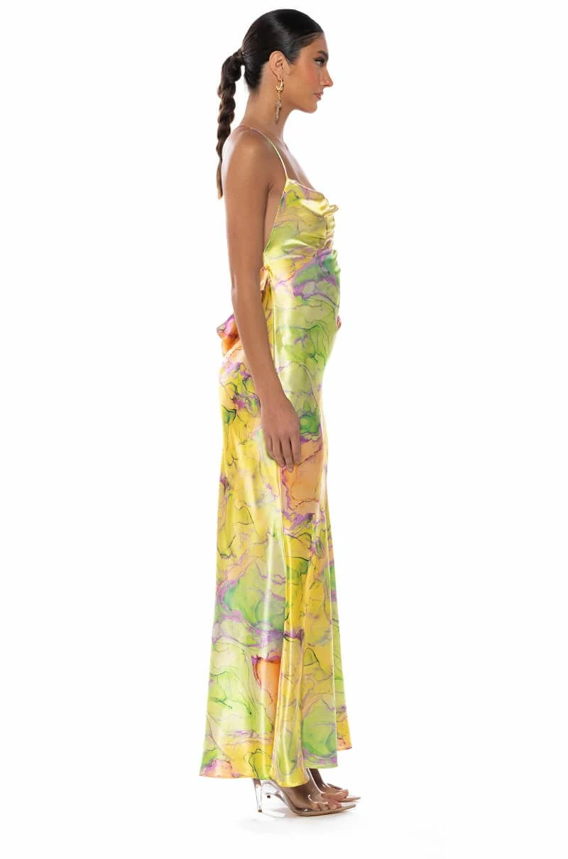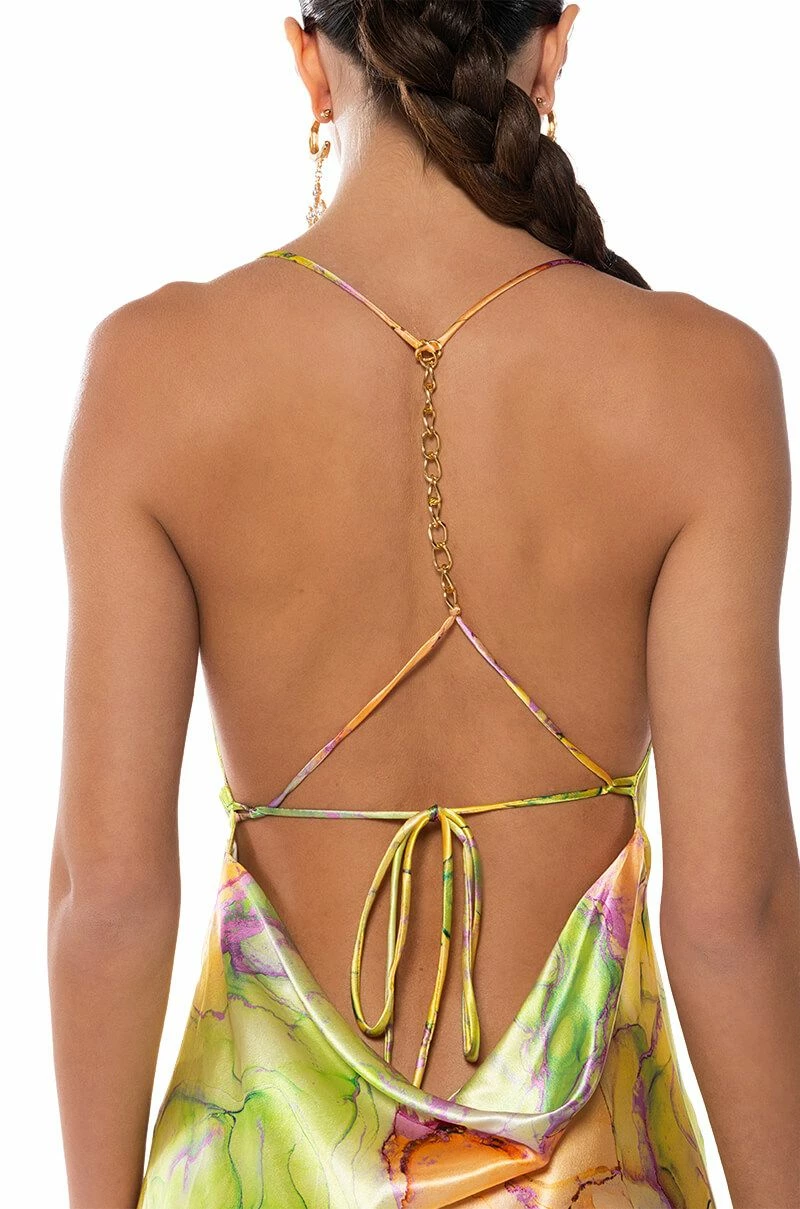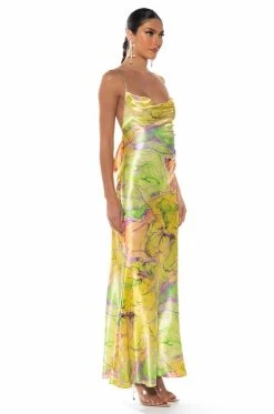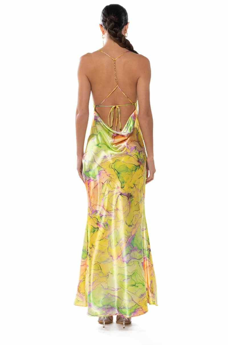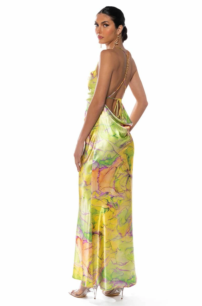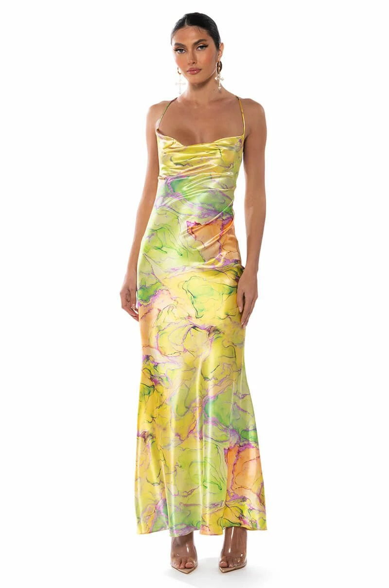 The AKIRA Label Going Up Satin Maxi Dress In Lime is made from a sleek, satin base fabrication and features a cowl neckline, thin, adjustable crossback tank straps with gold chain and tie-back detail, and a beautiful, stone-like print. Complete with a maxi length, a form-flattering silhouette, and a slip-on fit. Pair this piece with stiletto heels and a matching clutch to complete your elegantly sexy look.