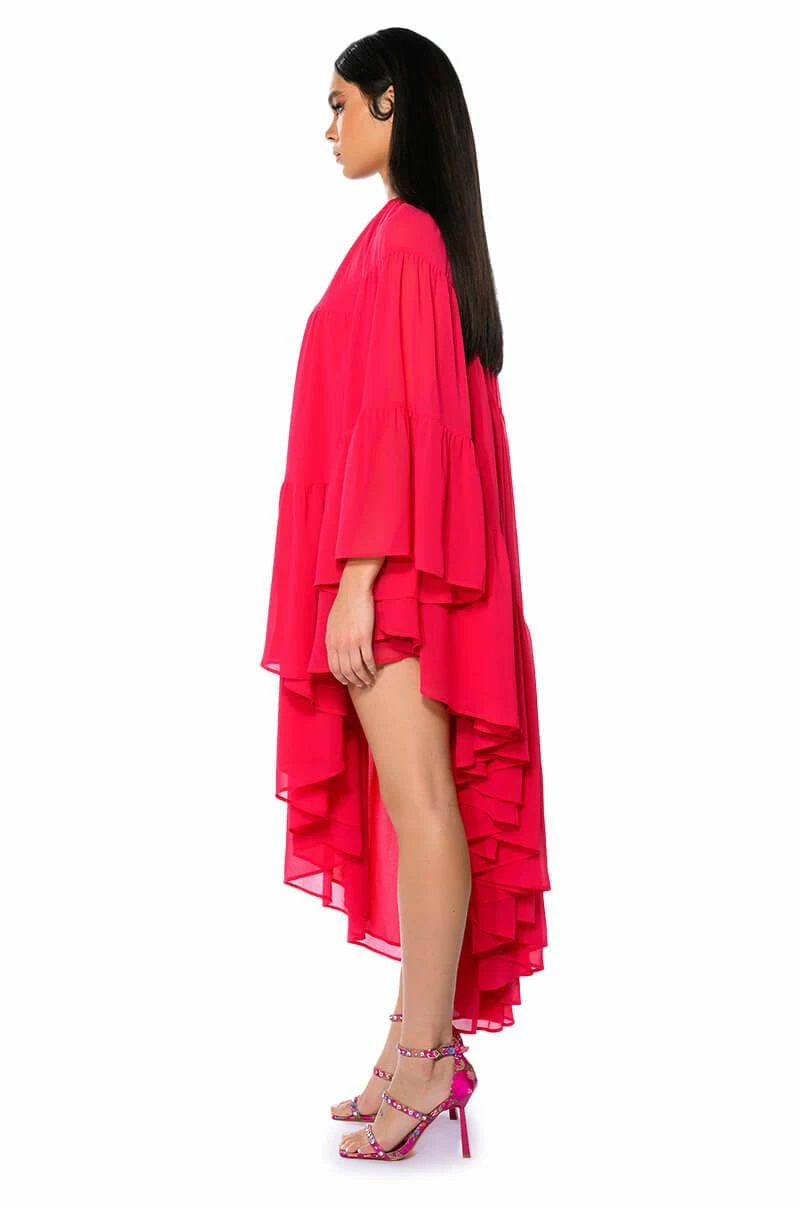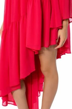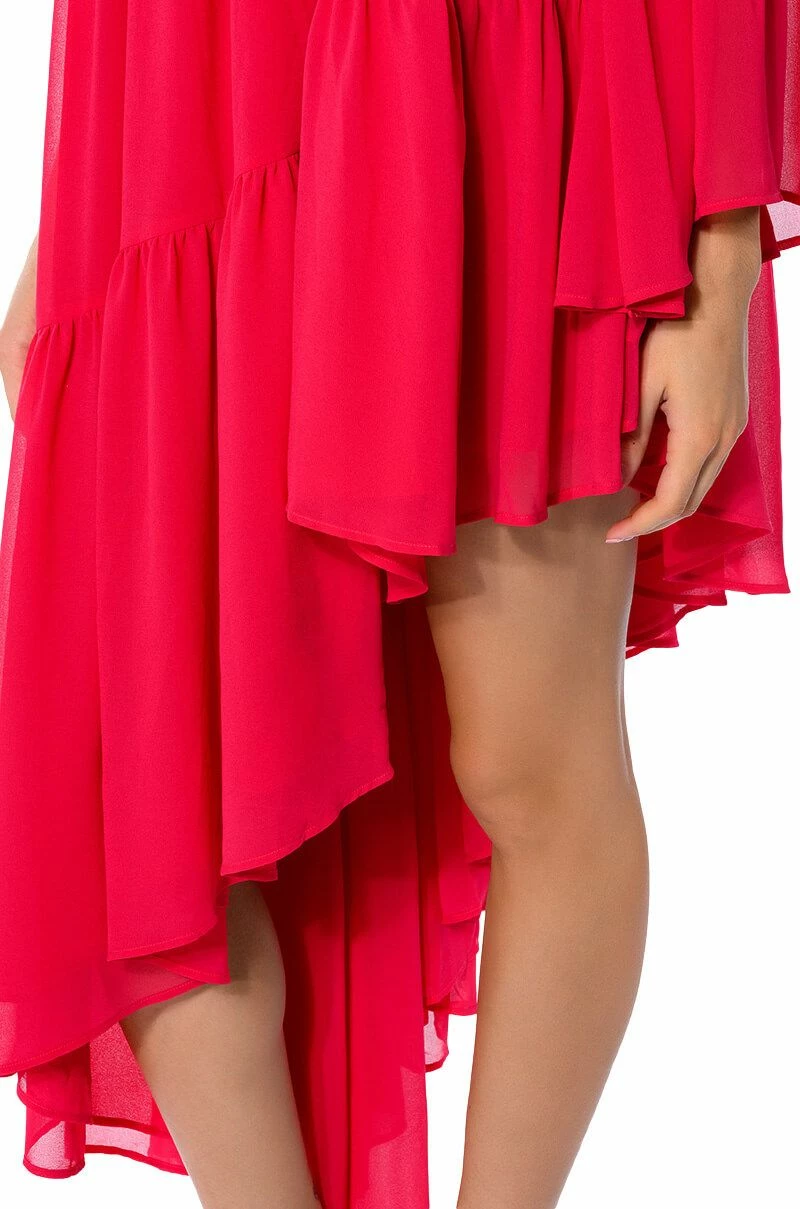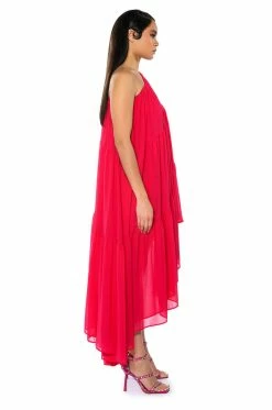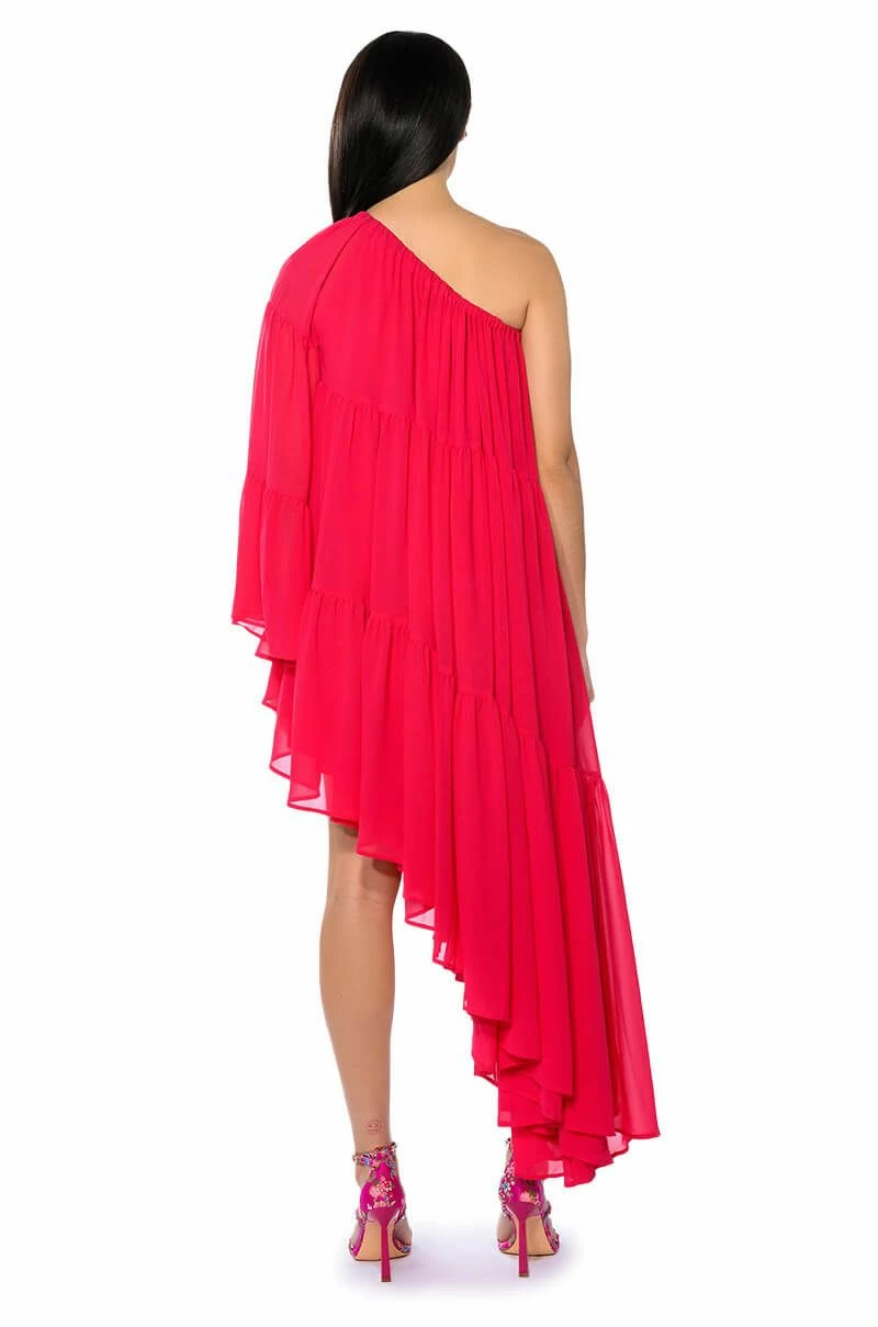 The AKIRA Label Harlow One Shoulder Asymmetrical Maxi Dress is made from a sheer, lightweight fabrication and features a one shoulder design, a long blouson sleeve, tiered body detailing, a layered flare skirt, an asymmetrical hem, and a slip-on fit. Style this piece with strappy sandals and a baguette bag to complete your flowy fun look.