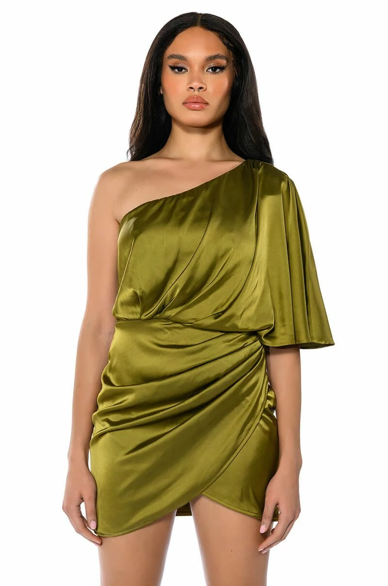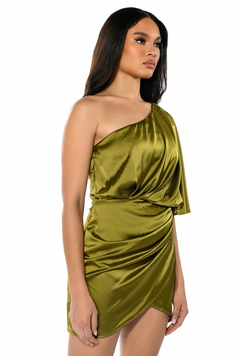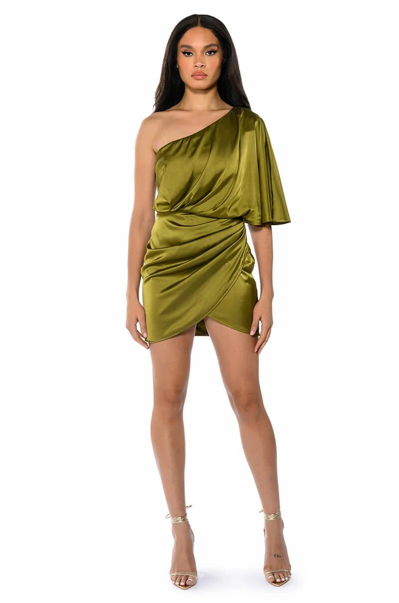 The Harmony One Shoulder Mini Dress is made from a smooth, satin fabrication and features a draped one shoulder design, elegant draping at the front side, a mini length, and a concealed side zipper closure. Pair with strappy heels and a clutch, for a sexy and chic soirée look!