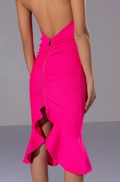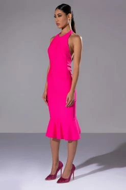The AKIRA Label Heiress Sleeveless Peplum Dress In Pink is made from a stretch knit fabrication and features a halter neckline with metal clasp closure, a sexy open back, and a bodycon silhouette. Complete with a back zipper closure, ruched backside, and a midi length peplum hem. Pair with a pearl-embellished headband and strappy pumps for a luxurious look.
