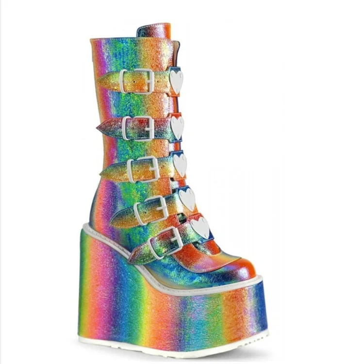 Steady chunky platform, cushioned footbed, slip-resistant outsole deal with your hurting worry. 8 sizes are offered to fit your feet. 4 colors are provided, pink, rainbow, black and white, showing your different features. Heart-shaped metal is full of sweetness and loveliness. Adjustable buckle closure change the width of shoes to keep it fit and comfortable.