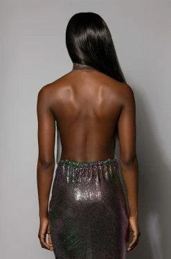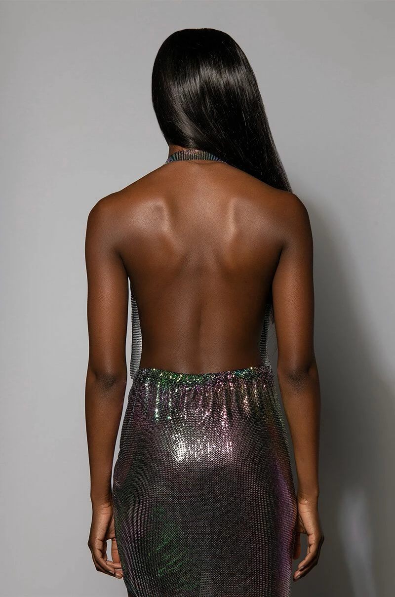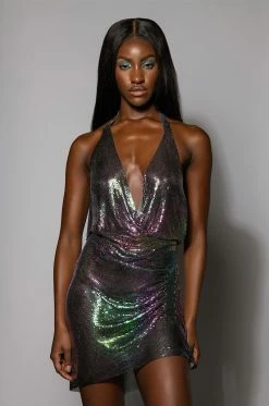 The AKIRA Label Hotness High Shine Iridescent Chainmail Mini Dress is the mesmerizing statement piece you’ve been waiting for! This dress is made from a metallic chainmail fabrication and features a wrapped plunging neckline, a halter neck, and a sexy open back. Complete with ruching at the side and an elastic waistband. Pair this with pumps and The AKIRA Label Amirah Black Purse for the final hot girl look!