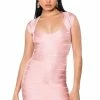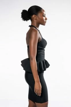 The AKIRA Label Hustler Ruffle Detail Bandage Mini Dress is a glamorous mini length cocktail dress featuring a curve hugging bandage knit fabrication, a plunging neckline, ruffle peplum detailing, thin halter neck straps with hook and eye closures, and a concealed back zipper closure. Pair with patent pumps and a faux fur trim jacket for a luxe look.