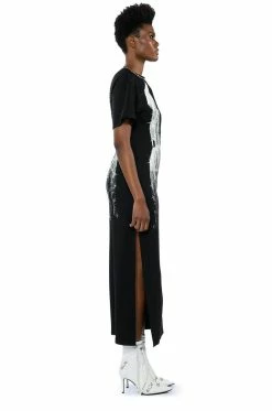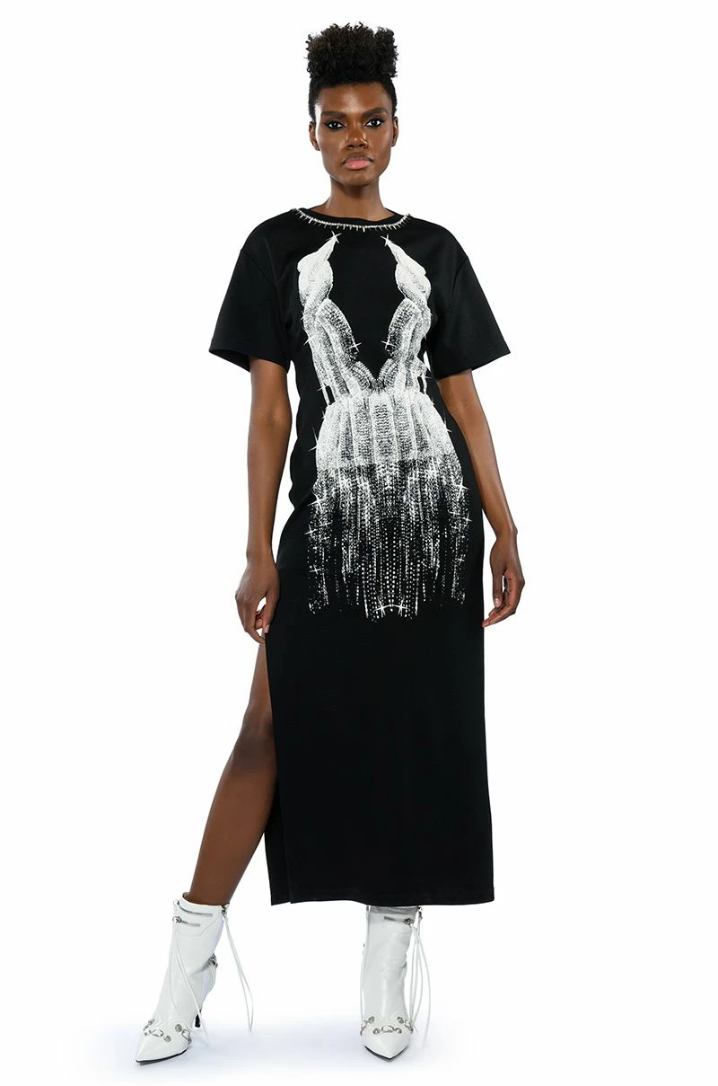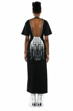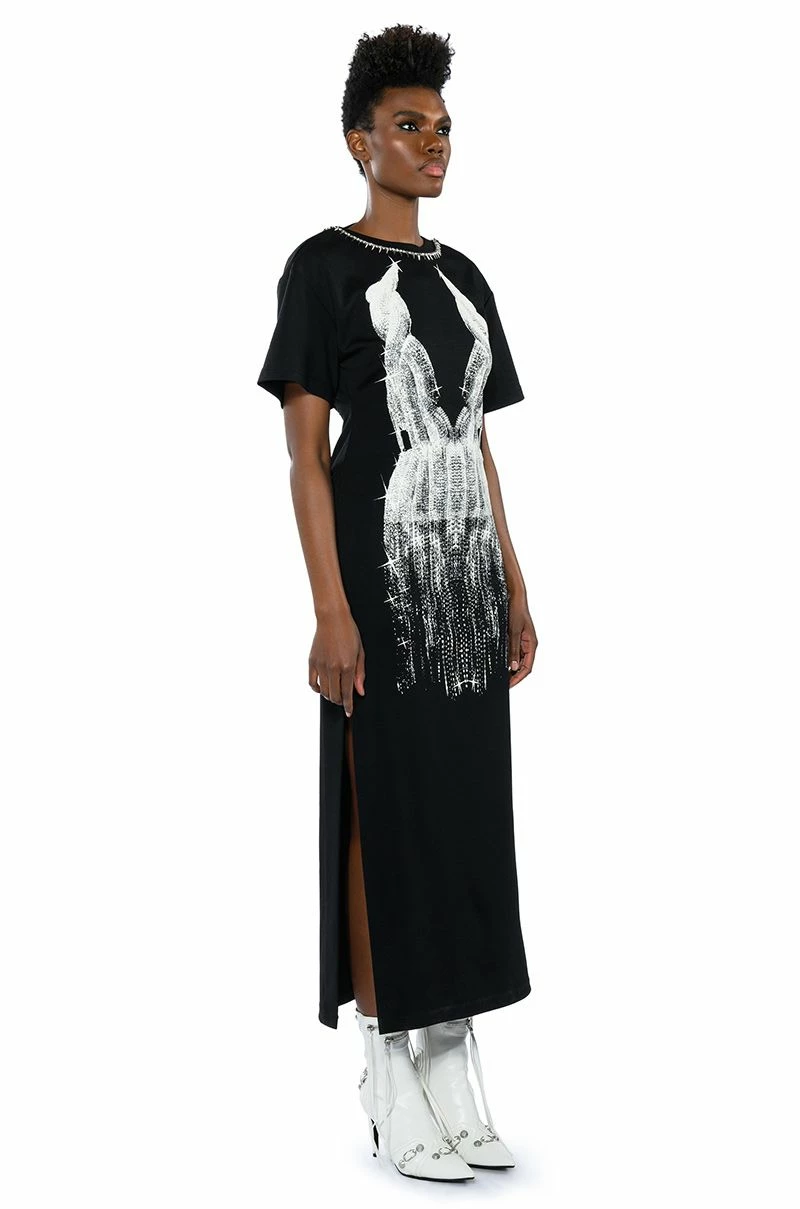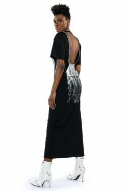 The AKIRA Label Illusions Embellished Spike Detail Graphic Maxi Dress is made from a stretchy fabrication and features a high, rounded neckline, short, boxy sleeves, a glimmering mini dress front and back graphic, princess seam detailing, a sexy open back with an adjustable bar across the top, a long side slit, a maxi length silhouette, and a pull-on fit. Complete with opulent, rhinestone-embellished spike detailing along the neckline and open back cutout.