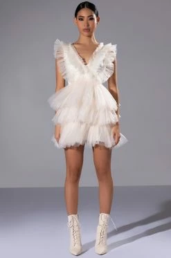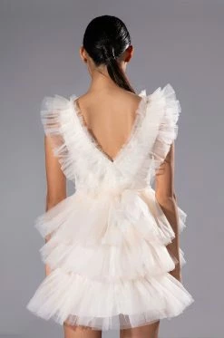 The AKIRA Label In The Garden Tulle Mini Dress features a voluminous tulle fabrication, a plunging neckline, wide tank straps, and a soft satin lining. Complete with a tiered tulle skirt, a cinched waist ,and a concealed side zipper closure.