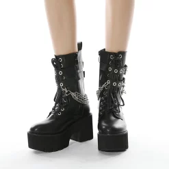 This gothic boots made by rubber sole. The elements of industrial style boots are in it, lace-up, chain-trimmed and belts with key-holes. You are the cool and statement woman. Steady chunky platform brings comfort to you , making you relax for one day. Chunky platform could let your legs slimmer and optimize your body ratio. You are the one.