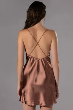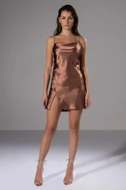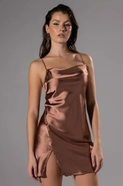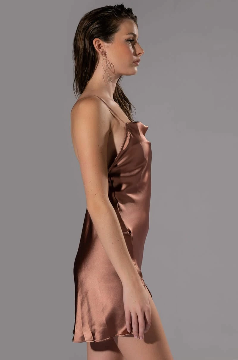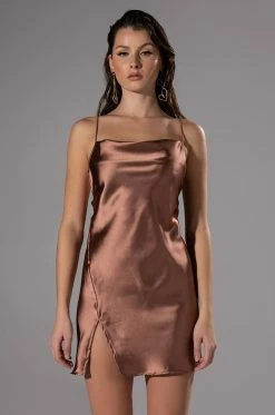 Classy, bougie, sexy. The AKIRA Label Let It Be Simple Cross Back Mini Dress has a sleek, satin design featuring a cowl neckline and a side thigh slit. Complete with slim cross back straps and a mini length hem. Slip into this dress, and pair it with stiletto boots and a moto jacket for your next night out!