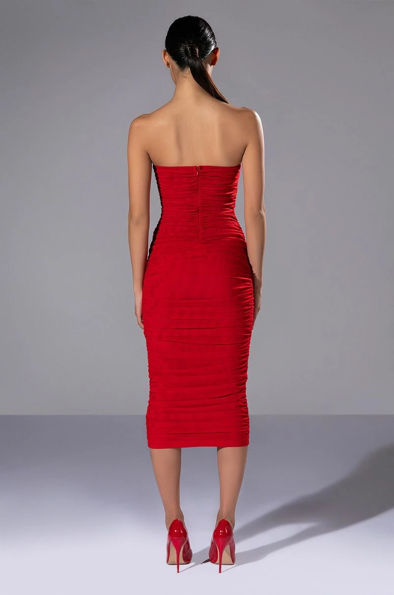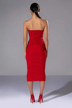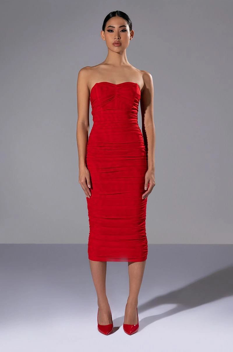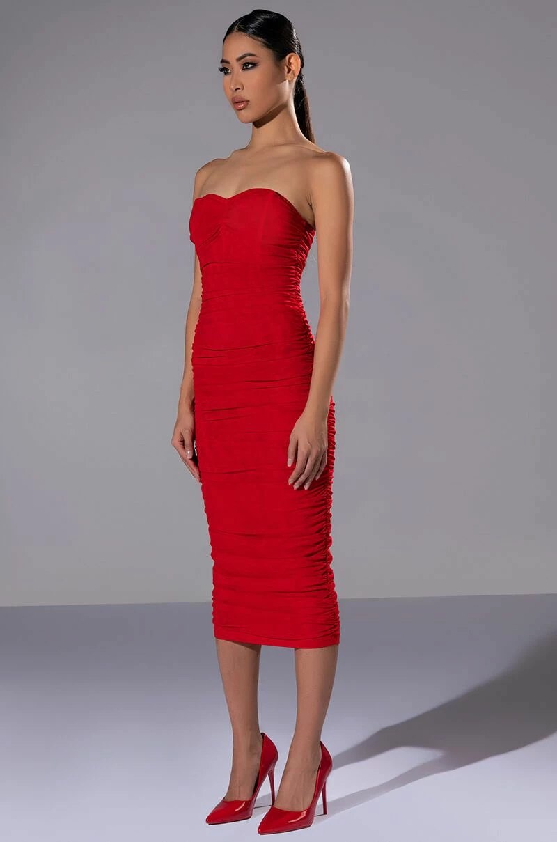 Speak up loud and proud in The AKIRA Label Like I Said Strapless Midi Mesh Dress! This sultry piece is made from a layered mesh fabrication and features a sweetheart neckline, a strapless design, boning for structure, a sexy bodycon fit, a midi length silhouette, ruched body detailing, and a tonal back zipper closure. Pair this piece with strappy sandals and a clutch to complete your sexy look.