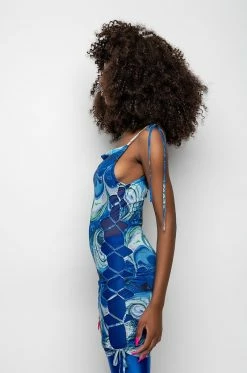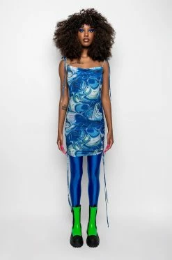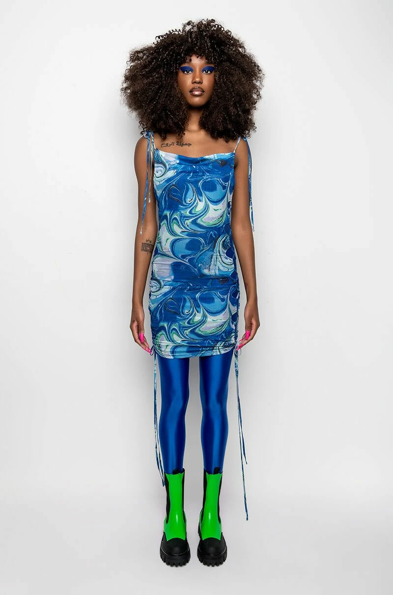The AKIRA Label Lil Baby Mesh Print Mini Dress is made from a layered mesh fabrication and features a cowl neckline, multicolor swirl print patterning, thin, tied tank straps, side cutouts with lace up detailing, tie details at the hem, and a pull-on fit. Complete with a bodycon silhouette and mini length.