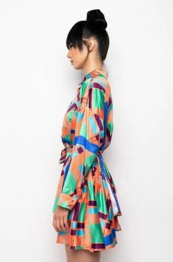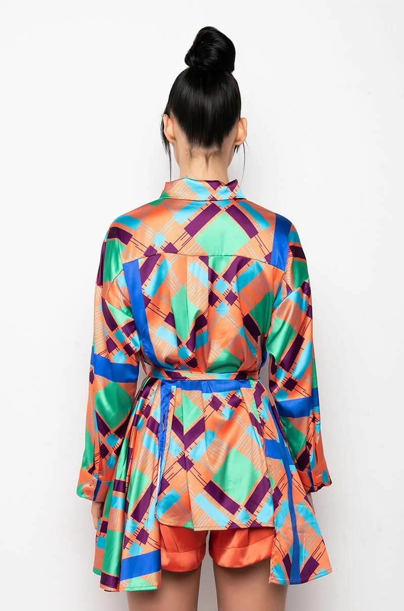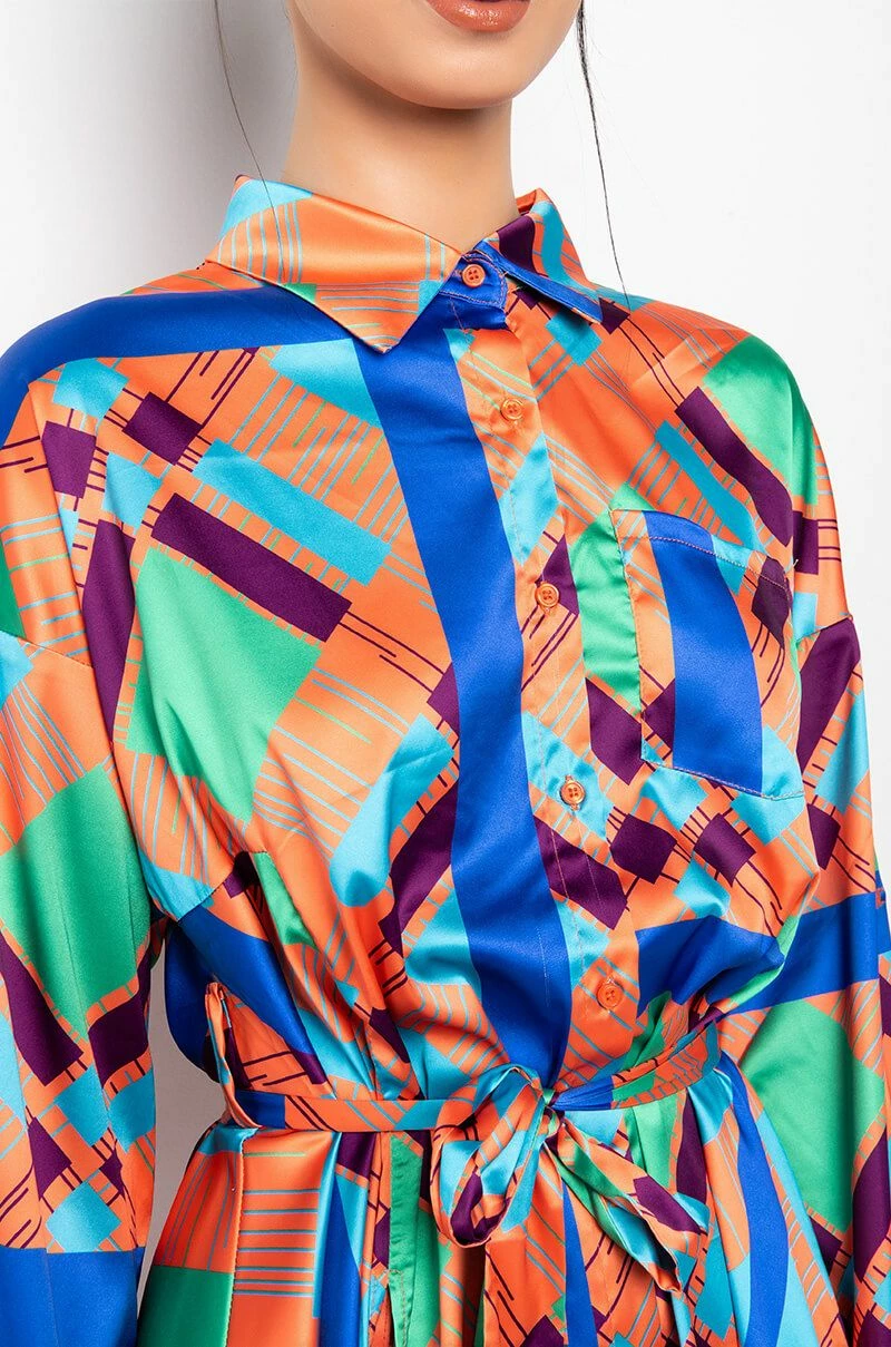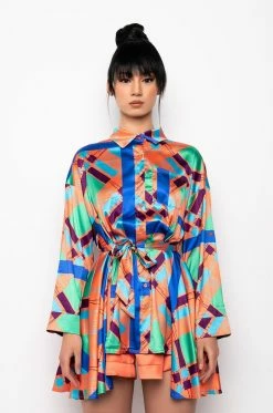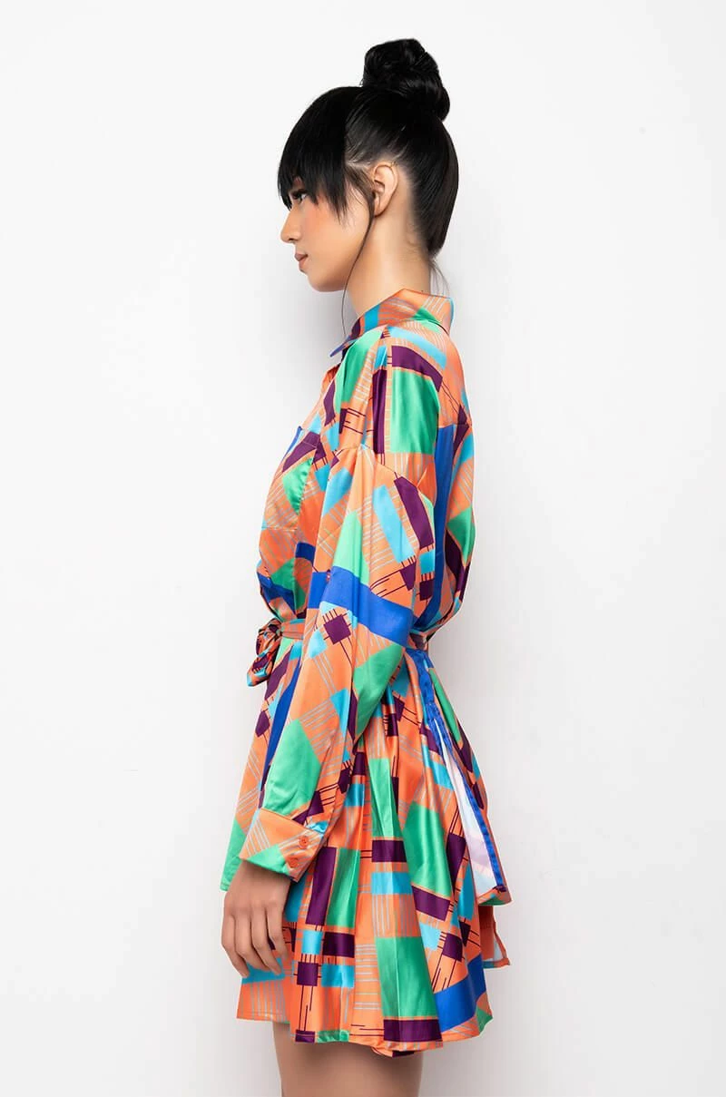 The AKIRA Label Live It Up Button Up Mini Dress is made from a lightweight satin fabrication and features a multicolor graphic vintage print, point collar, chest pocket, long sleeves with buttons at the elbows and cuffs, a button down placket, belt loops, a self tie waist, a mini length silhouette, and a split hem.