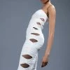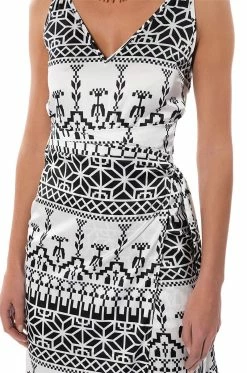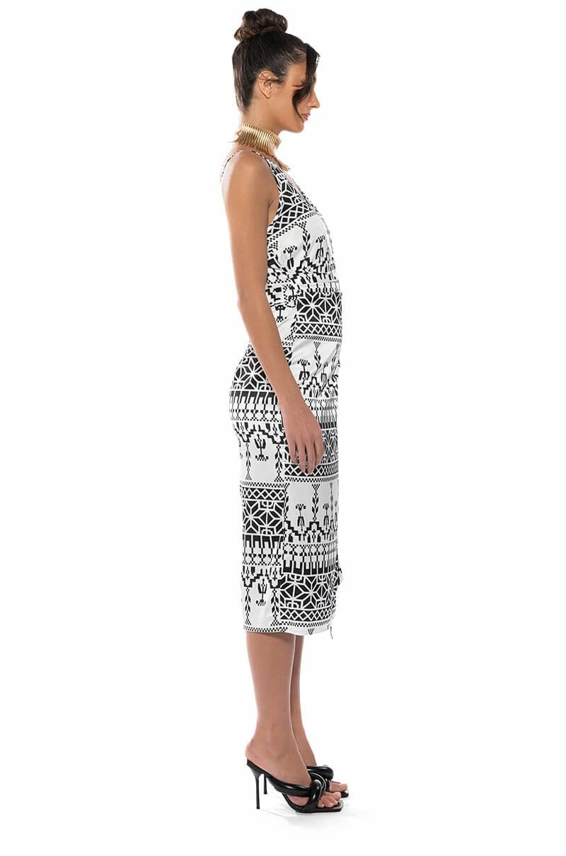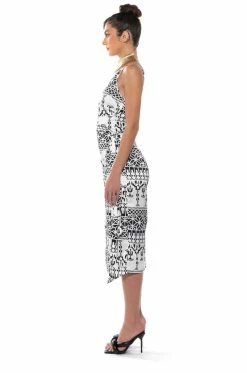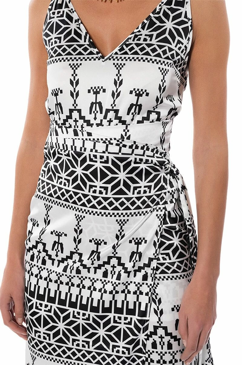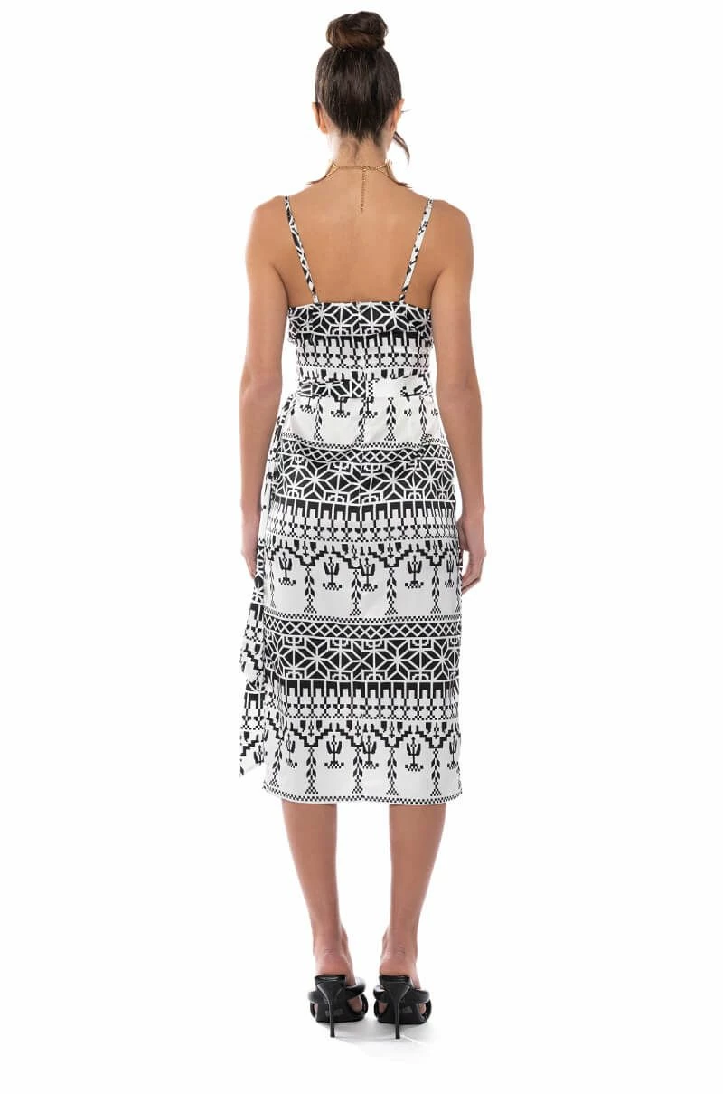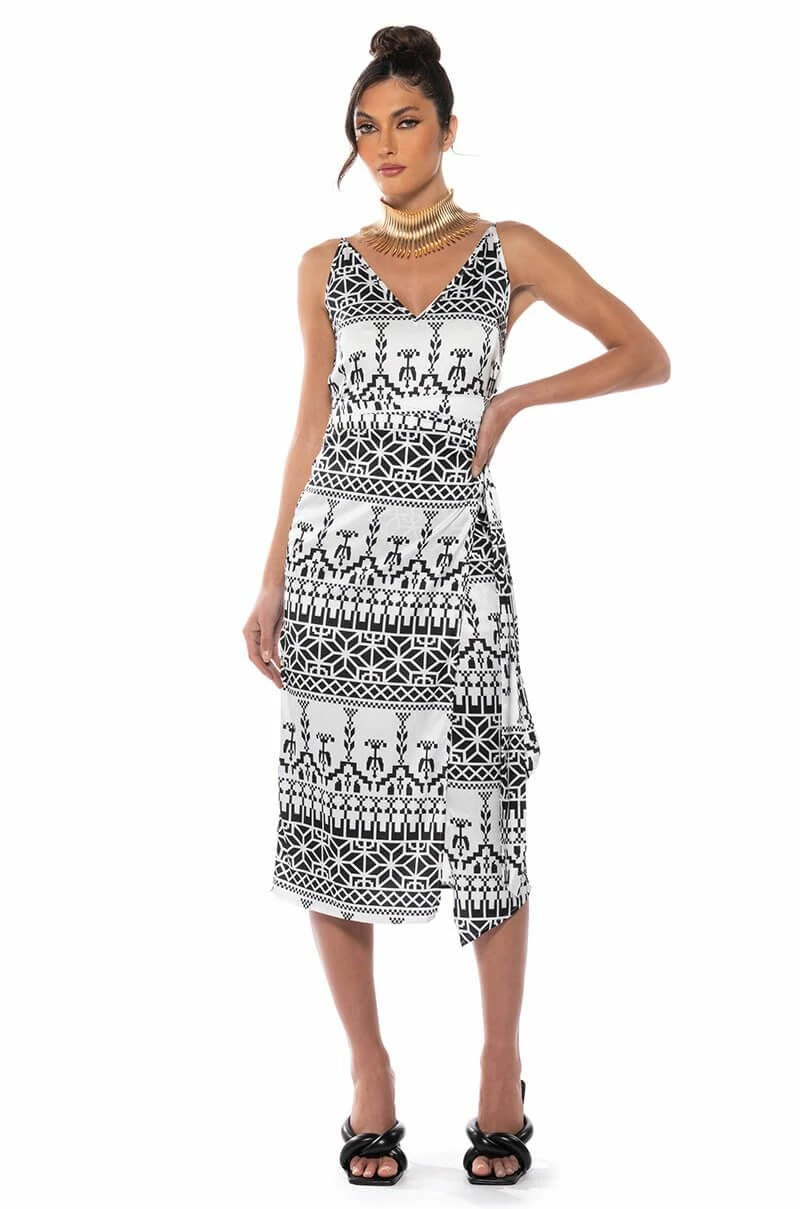 The AKIRA Label Lucy Satin Print Midi Dress is made from a satin base fabrication and features V-neckline, slim adjustable tank straps, a sleeveless silhouette, and an abstract graphic print throughout. Complete with a wrapped self-tie silhouette, a midi length, and a slip-on fit. Style with heeled sandals for a chic night out look.