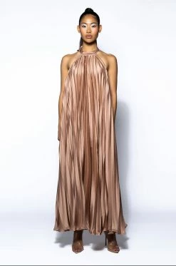 The AKIRA Label Make Me Sway Pleated Halter Maxi Dress is made from a pleated, lightweight fabrication and features a tie halter, a high, rounded neckline, a sleeveless design, and a flowy, maxi length silhouette. Complete with a tonal back zipper closure. Pair this piece with stiletto sandals to dance the night away.