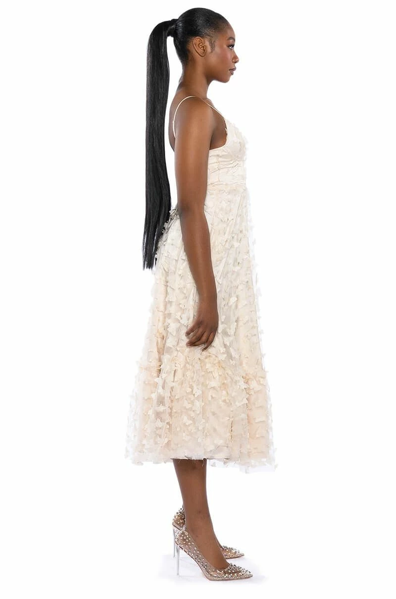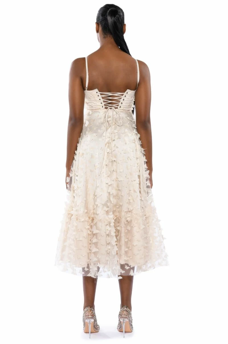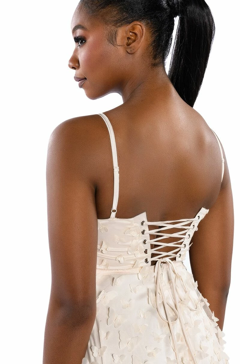 Float like a butterfly in The AKIRA Label Mariposa Sleeveless Applique Maxi Dress. This show-stopping gown features a layered tulle fabrication, padded bust cups, a sweetheart neckline, a corset-inspired boned bodice, and adjustable tank straps. Complete with a tulle overlay, butterfly appliques, subtle silver metallic trim, a maxi length ball gown skirt, a smooth inner lining, and a lace up back closure.