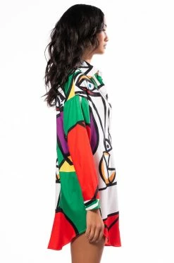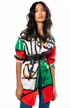 You’re a work of art, sis. The AKIRA Label Masterpiece Button Down Mini Dress features a smooth, lightweight shirting fabrication, a bold abstract art multicolor print, a collared neckline, long sleeves, button cuff details, a mini length, a rounded drawstring hem, and a button up front closure. Layer this punchy piece over thigh high boots for a complete look.