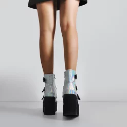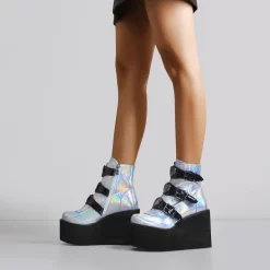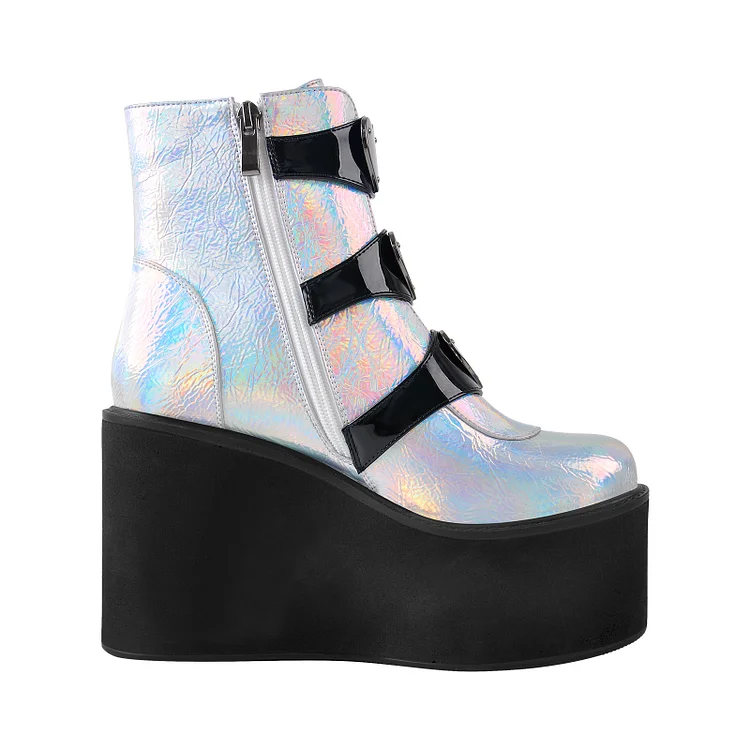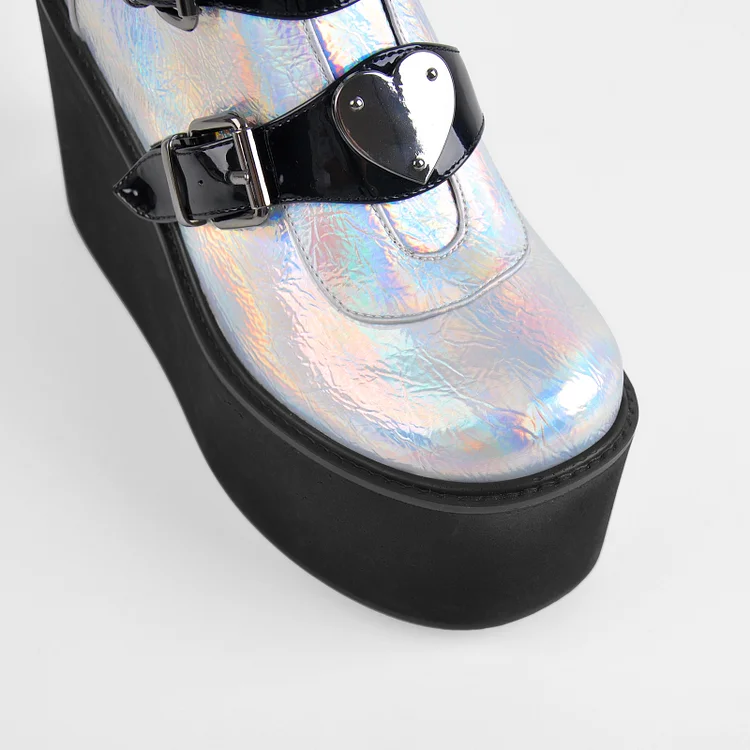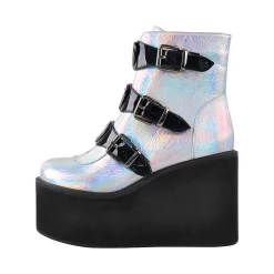 This gothic boots made by rubber sole. 3.14 inches platform height. Steady chunky platform, cushioned footbed, slip-resistant outsole deal with your hurting worry. 8 sizes are offered to fit your feet.Heart-shaped metal is full of sweetness and loveliness. Adjustable buckle closure change the width of shoes to keep it fit and comfortable.