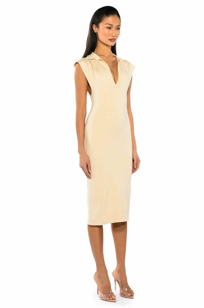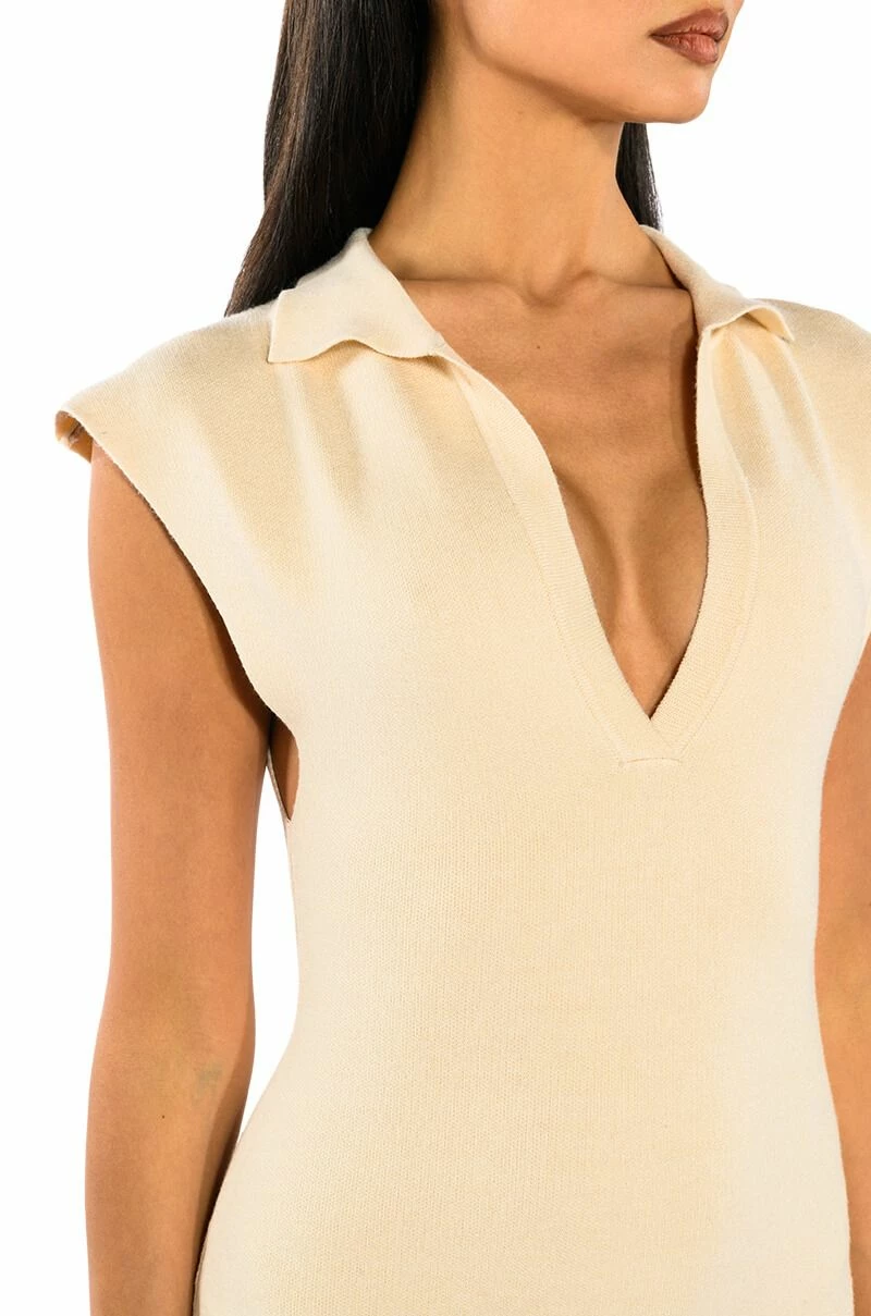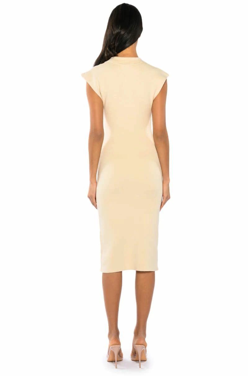 The AKIRA Label Midnight City Knit Midi Dress in Cream is made from a soft knit fabrication and features an open collared neckline, a sleeveless silhouette, a sexy bodycon fit, midi length, and a slip-on design. Pair this piece with leggings and ankle booties to finish off your effortlessly chic seasonal look.