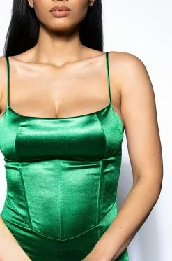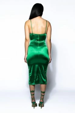 The AKIRA Label Never Around Corset Midi Dress is made from a slick satin fabrication and features a rounded neckline with padded cups, thin spaghetti straps, a corset bodice with boning for structure, a sexy bodycon fit, a side slit, and a midi length silhouette. Complete with a tonal back zipper closure.