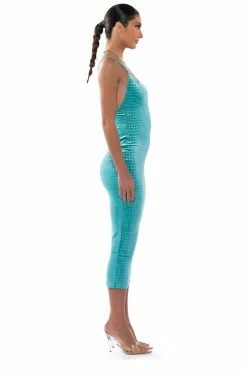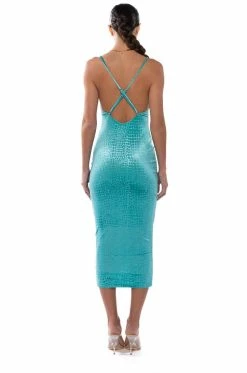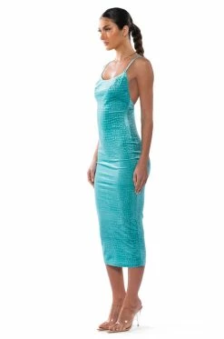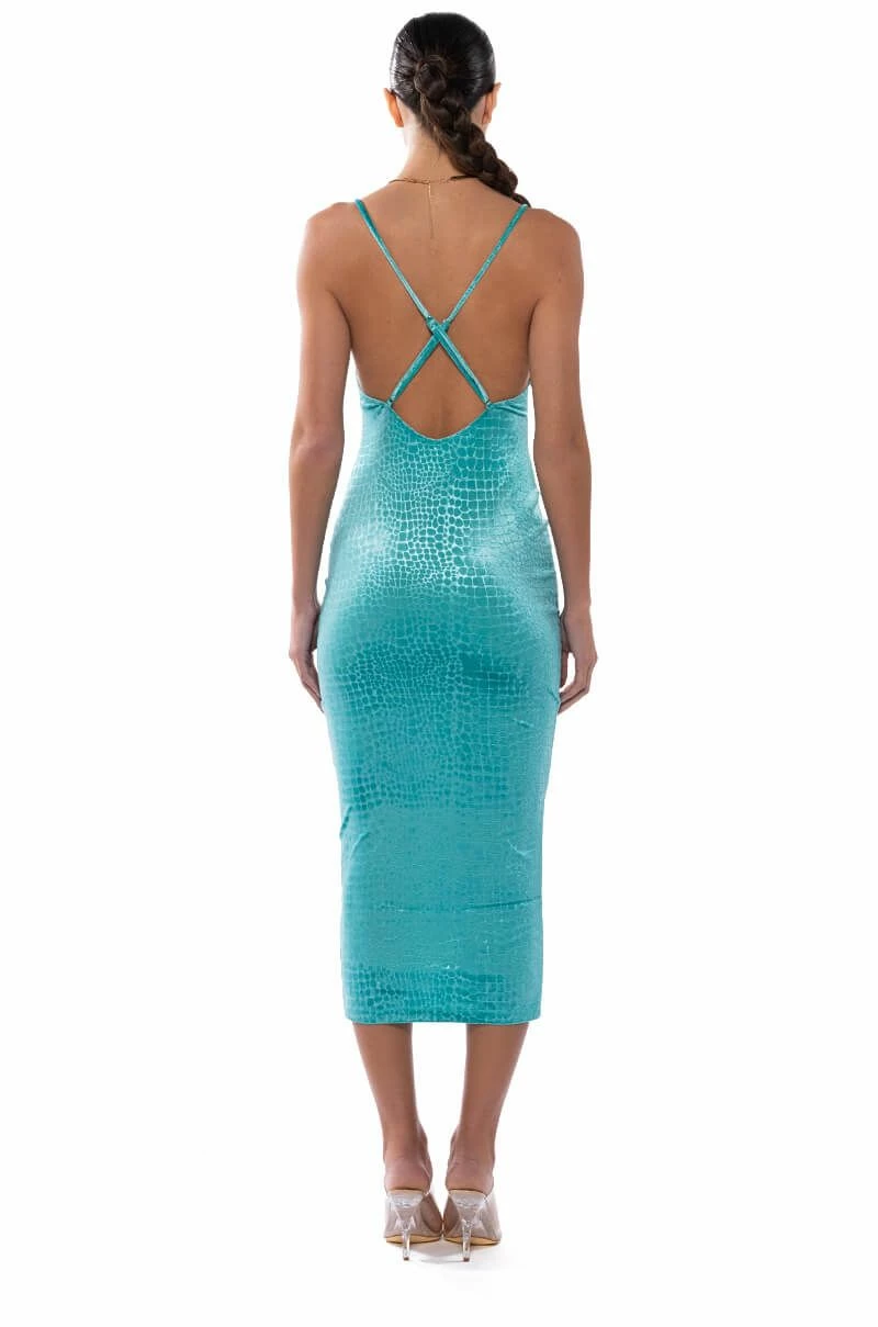 The AKIRA Label Never Forget Shimmer Midi Dress is made from a stretchy, velvet base fabrication and features an embossed animal print design, scoop neckline and thin, adjustable crossback tank straps. Complete with a maxi length, a form-flattering bodycon silhouette, and a slip-on fit. Style with bow-embellished pumps and your signature accessories for the full, unforgettable look!
