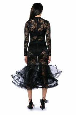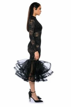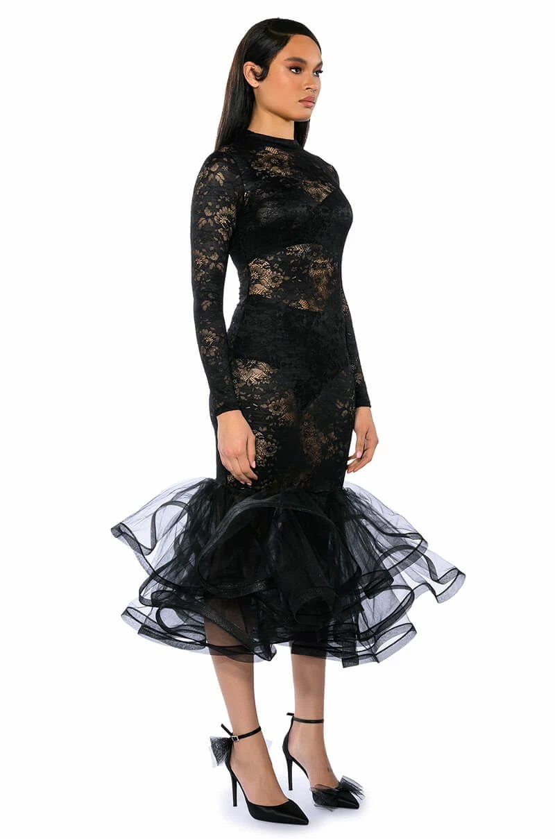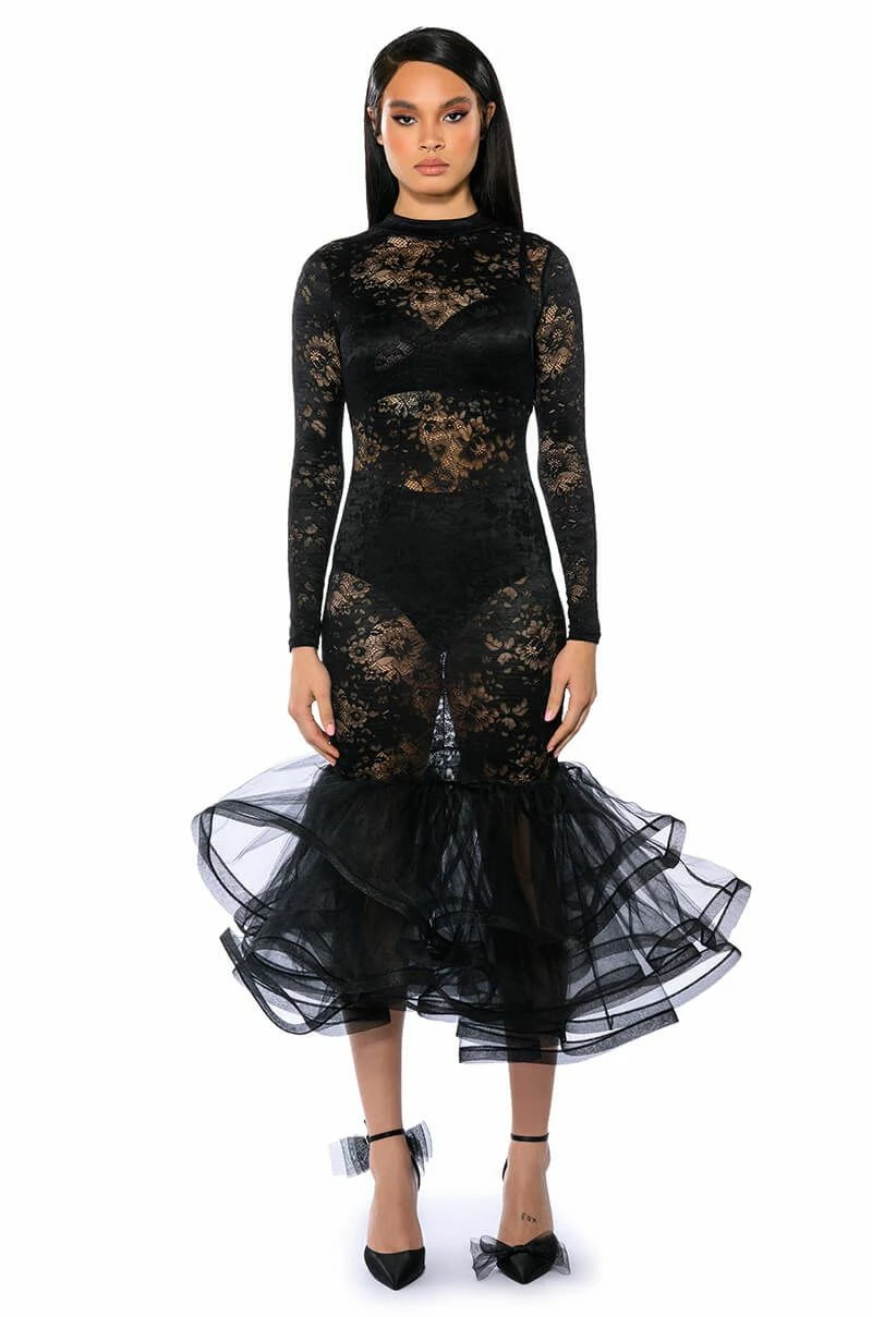 The AKIRA Label Night Of My Life Lace Maxi Dress is made from a sheer floral lace fabrication and features a mock neckline, long sleeves, princess seam detailing, a sexy bodycon fit, a reinforced, layered ruffle hem, and a maxi length silhouette. Complete with a tonal back zipper closure.