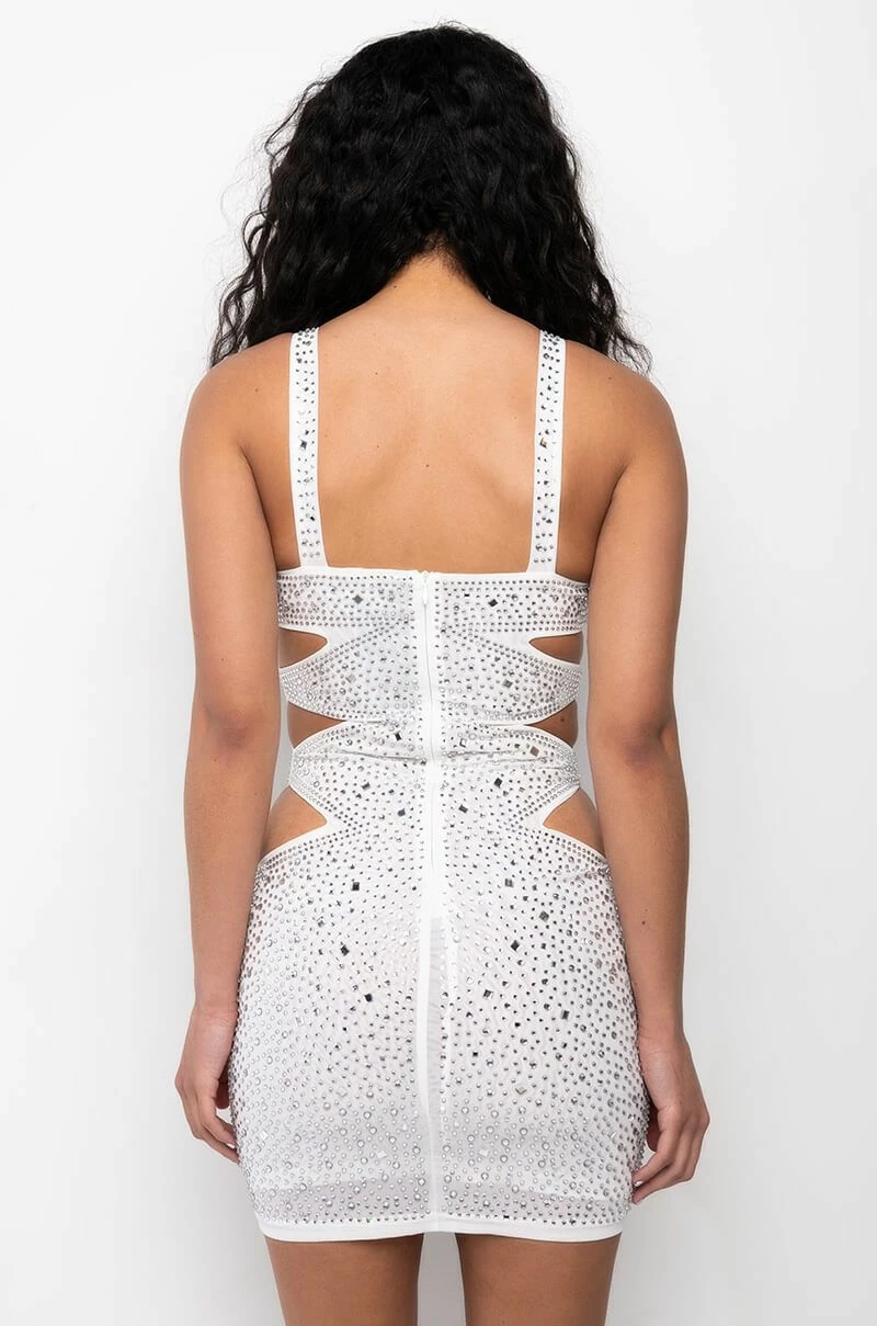 Let this mini do the talking. The AKIRA Label No Caption Needed Mini Rhinestone Dress features a lined mesh fabrication, wide tank straps, and a bodycon silhouette. Complete with a slight v neckline, side cut out detailing, and an all-over rhinestone base. Style this dress with a pair of strappy sandals for a complete look.