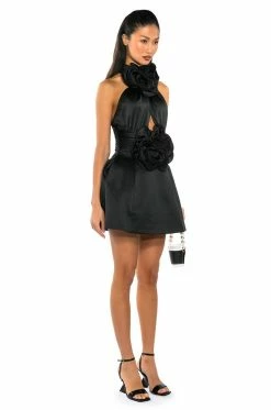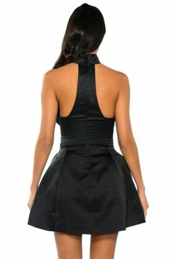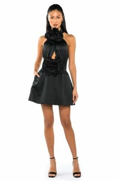 The AKIRA Label Not Your Babe Flower Detail Fit And Flare Mini Dress is made from a slick, shiny fabrication and features a high, rounded neckline, a sexy chest cutout, a sleeveless design, a wide waistband, a reinforced flare skirt, slit side pockets, a mini length silhouette, and a tonal back zipper closure. Complete with ruffled flower details.