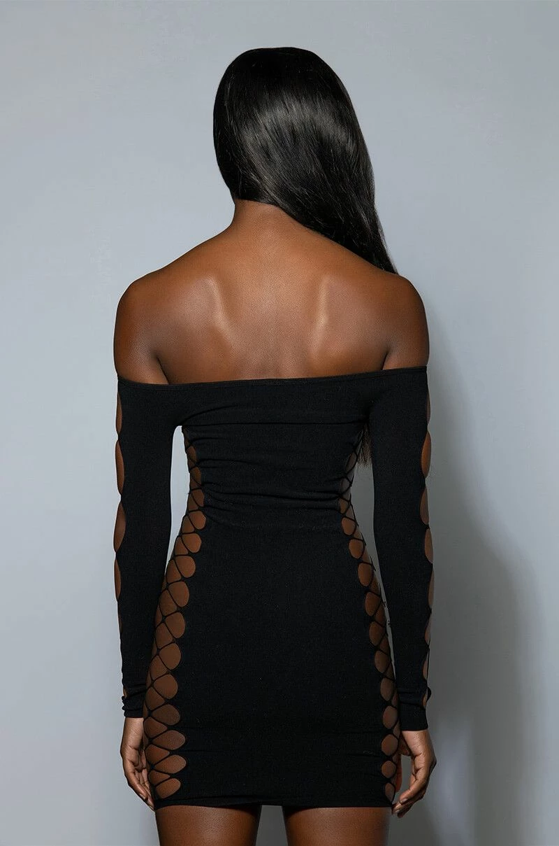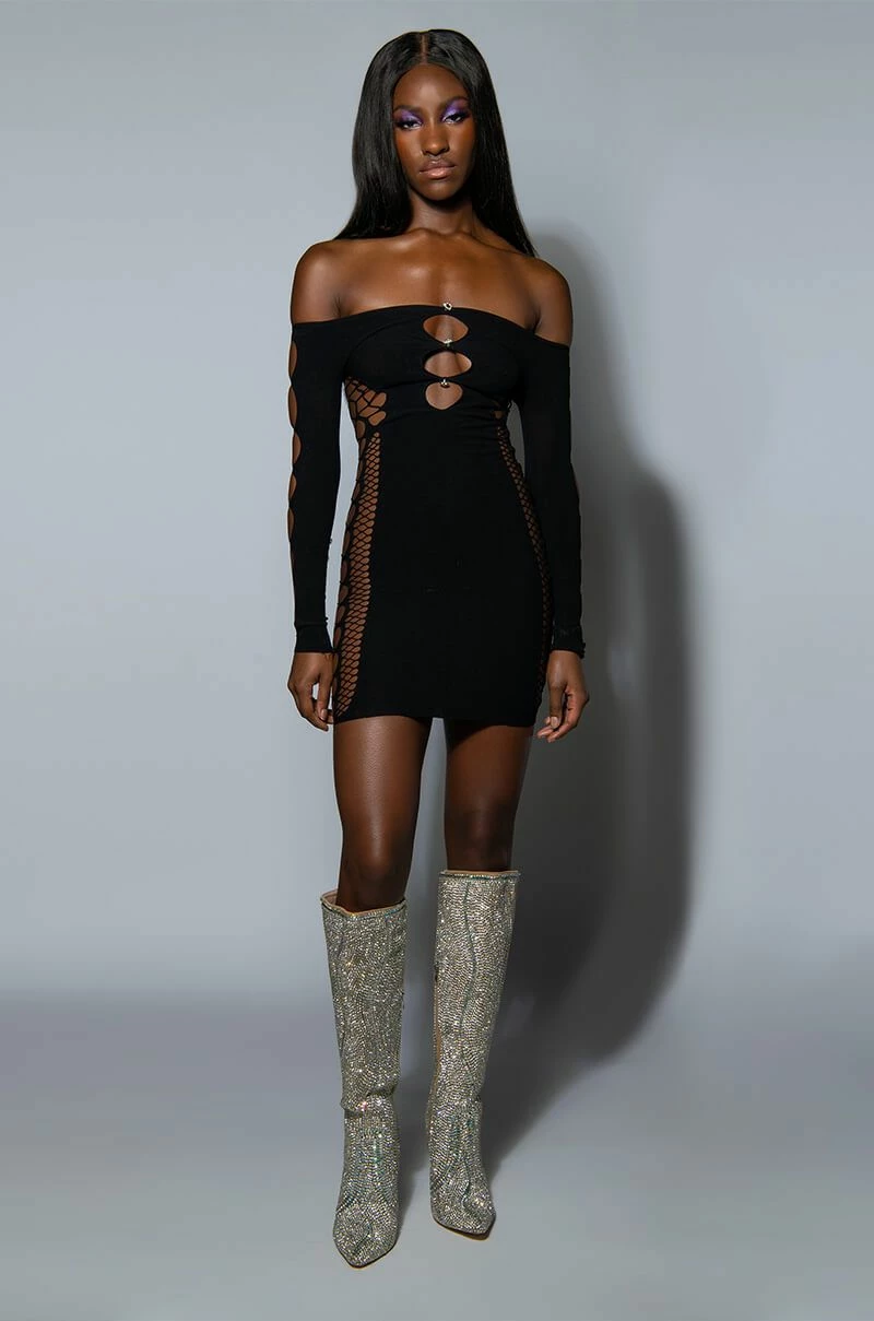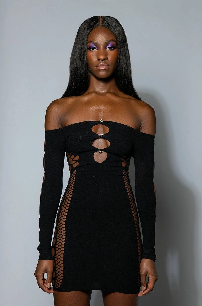 Turn up in The AKIRA Label On One Seamless Cut Out Mini Dress. This sexy, stretchy, bodycon mini features a textured sheer mesh fabrication, long sleeves, a crew neckline, and cut out detailing down the chest, sleeves, and sides. Complete with dual heart-shaped rhinestone charm accents at the bust. Pair this piece with an oversized jean jacket and strappy sandals for a complete look.