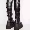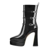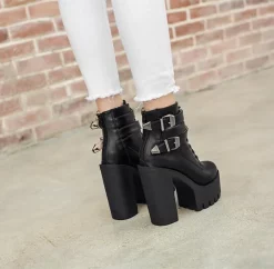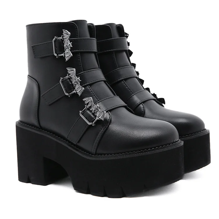 Steady chunky platform, cushioned footbed, slip-resistant outsole deal with your hurting worry. 8 sizes are offered to fit your feet. Solid black booties with bat metal decorated is classic and easy to pairs with anything. Adjustable buckle closure change the width of shoes to keep it fit and comfortable.
