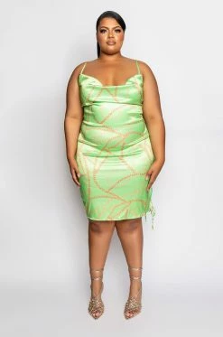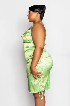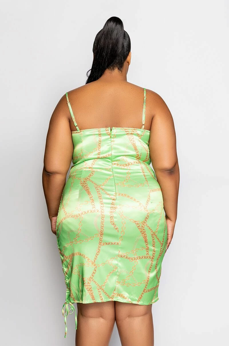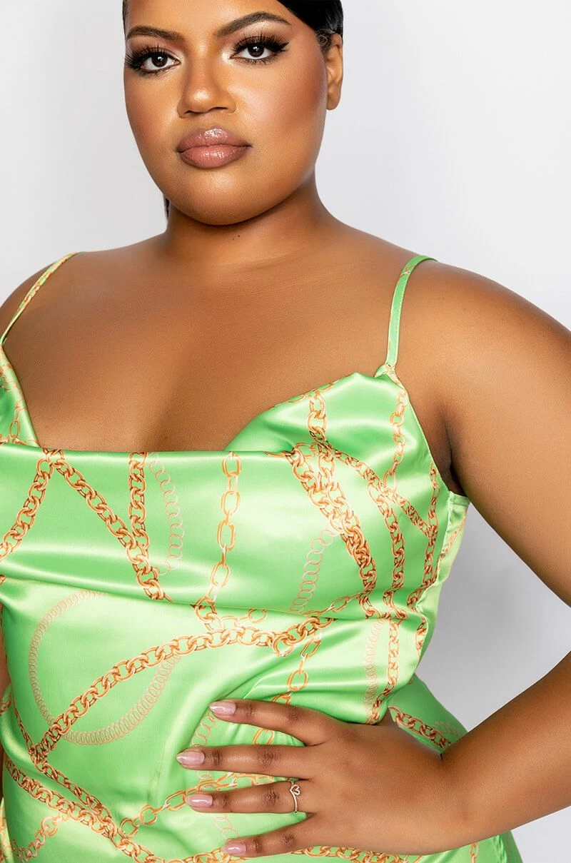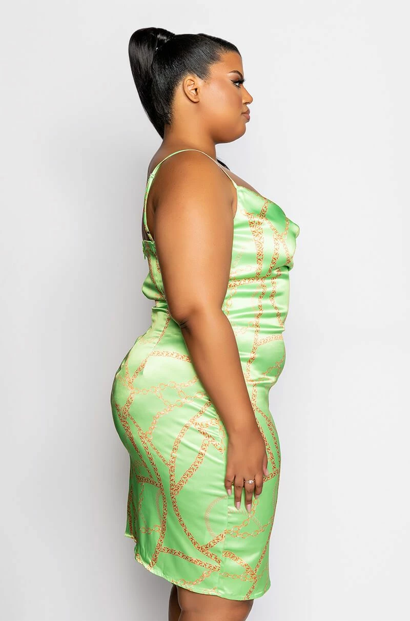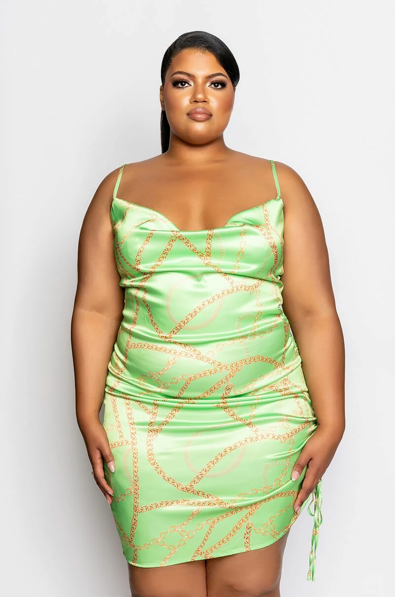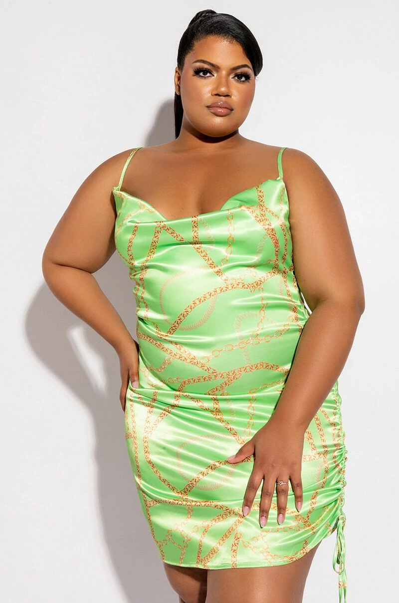 The AKIRA Label Plus All About The Chains Satin Mini Dress features a soft and seductive satin fabrication, a draped cowl neckline, slim adjustable tank straps, a mini length, chain print patterning, asymmetrical adjustable side ruched detailing, and a back zipper closure.