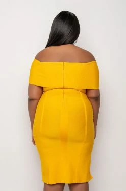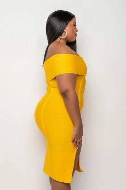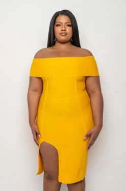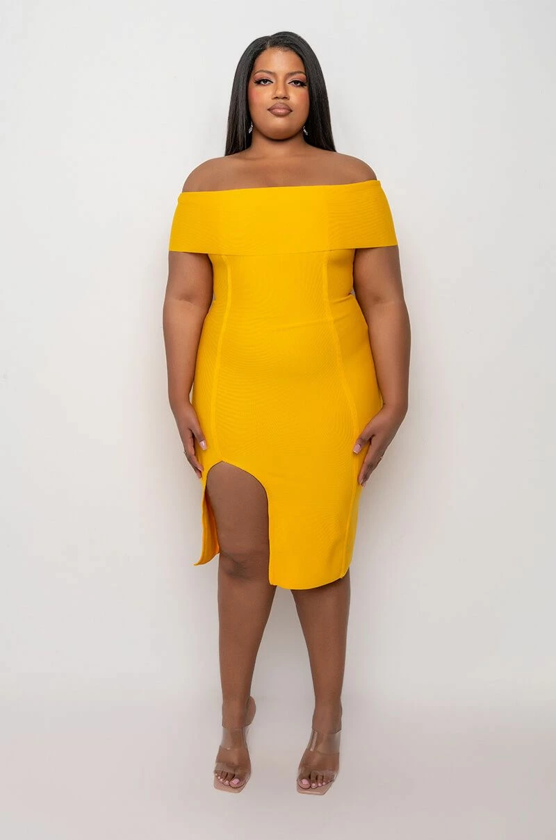 The PLUS AKIRA Label Make A Toast Off The Shoulder Bandage Dress is made from a curve bandage fabrication, and is complete with off the shoulder wide straps, a slit at the thigh, seam detailing along the body, and a back zipper closure.